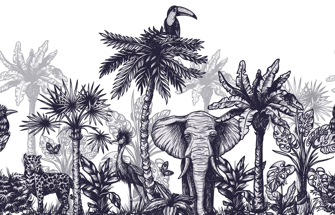 The superb sketchy animal wallpaper mural of the forest jungle renders wildness gleaming in black and white, an artful touch that lends elegance to any living room's backdrop. This living room mural wallpaper has a veritable cornucopia of jungle fauna, including an elephant of great size, a leopard with stealth, and a toucan dignifiedly sitting atop a palm. The sketch makes this aesthetic both stylish and subjective, narrating an incredible and deliberate story. Fine lines denote palm trees and undergrowth, creating depth that attracts one's eyes while imagination gets sparked. This animal wallpaper is a statement, bright and living as one enters together with the wild unleavened beauty of the jungle, into the home delivered in a style ya one that fits with both modern and classic decor.
