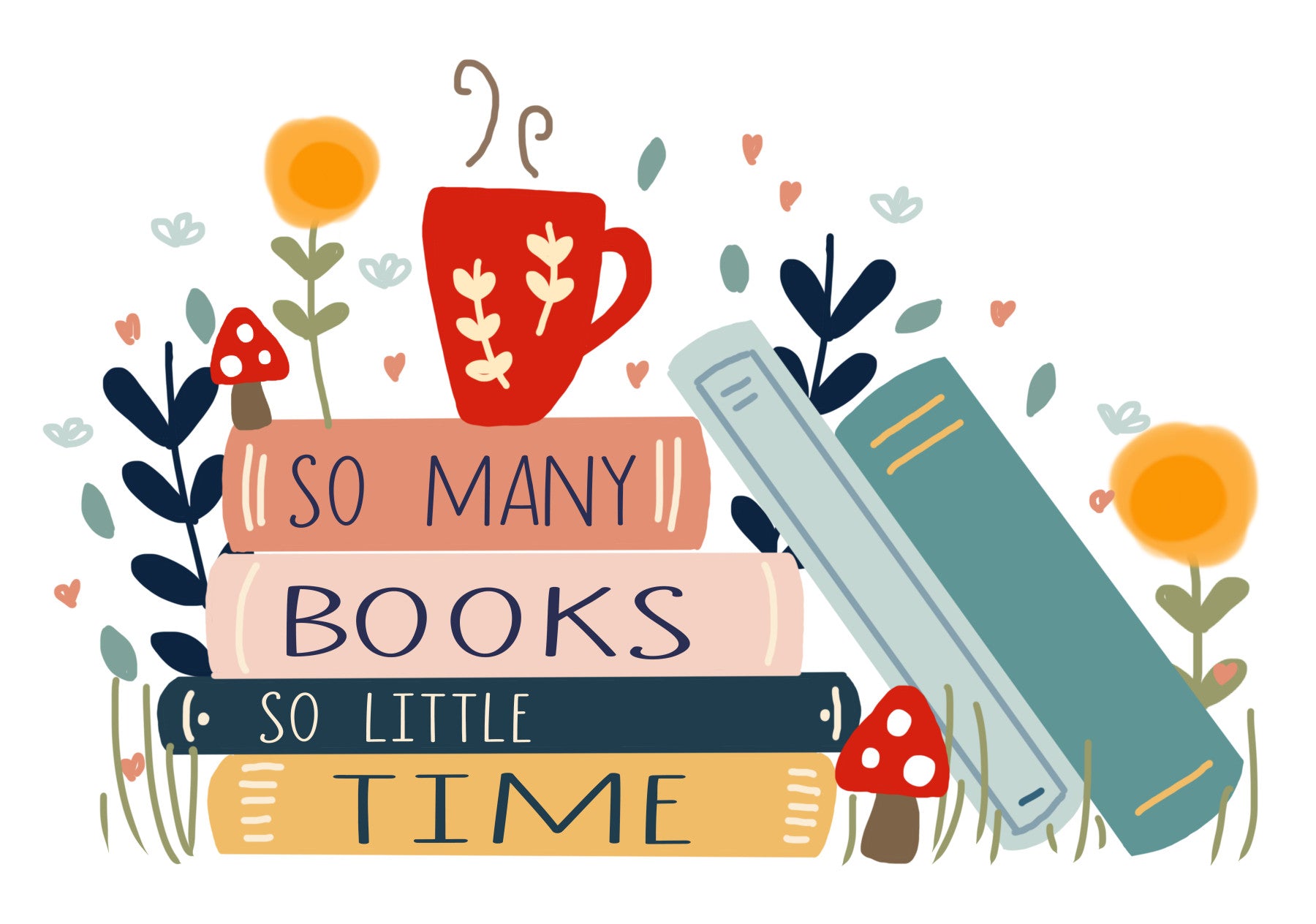 A charming and whimsical wallpaper featuring a stack of books nestled amongst playful floral elements and whimsical mushrooms. A warm red mug of steaming tea sits atop the books, suggesting cozy reading sessions. The books themselves are playfully labeled with the phrase 'So Many Books So Little Time', perfectly encapsulating the sentiment of every avid reader. The soft color palette and hand-drawn style create a relaxed and inviting atmosphere, making this the perfect wallpaper for book lovers who appreciate a touch of whimsy and charm in their digital space. The image evokes a sense of contentment and the delightful struggle of choosing what to read next.