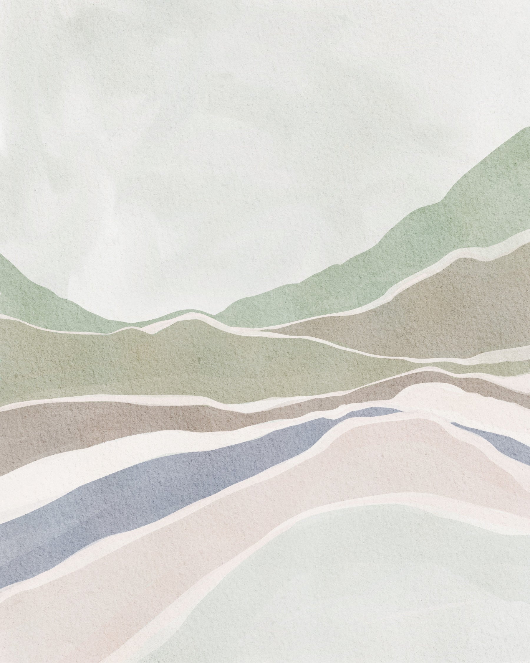 Embrace the gentle beauty of nature with this wallpaper featuring a stylized landscape. The soft watercolor style and muted color palette create a calming and soothing atmosphere. The image depicts rolling hills in shades of soft green, grey, and beige, evoking feelings of peace and tranquility. Its understated elegance makes it a perfect addition to bedrooms, living areas, or any space where a serene ambiance is desired. This wallpaper effortlessly blends modern minimalism with the organic charm of a watercolor painting, making it a versatile choice for any interior style.