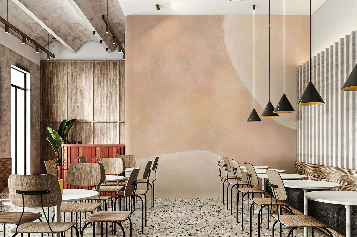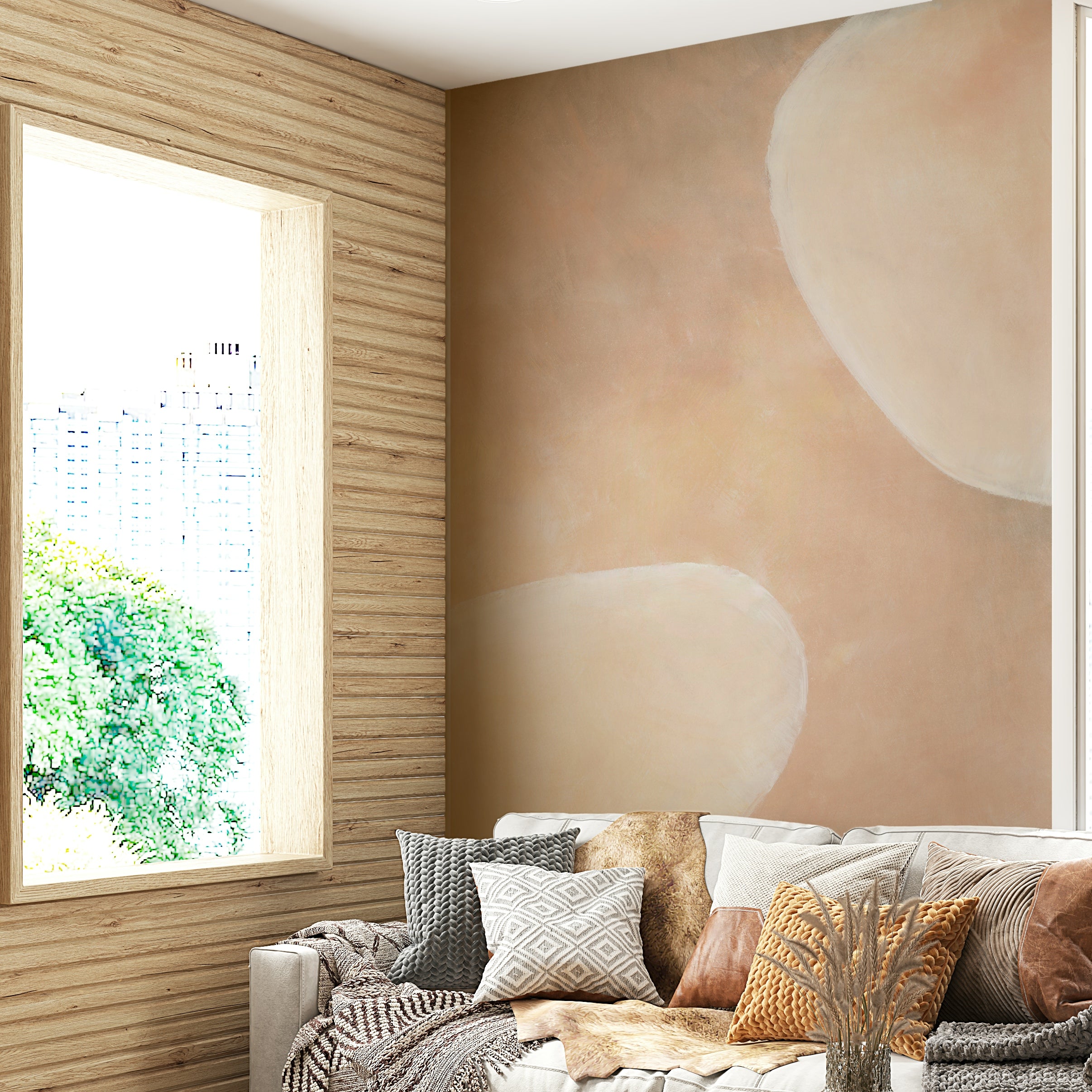 Embrace tranquility with this minimalist wallpaper, 'Soft Sands'. Delicate off-white shapes, reminiscent of gently sculpted sand dunes, rest on a warm, textured beige background. The subtle color palette and organic forms create a serene and calming atmosphere, perfect for a peaceful workspace or a relaxing bedroom. The understated elegance and smooth transitions of color make this wallpaper a sophisticated choice for those seeking a minimalist aesthetic infused with natural beauty.