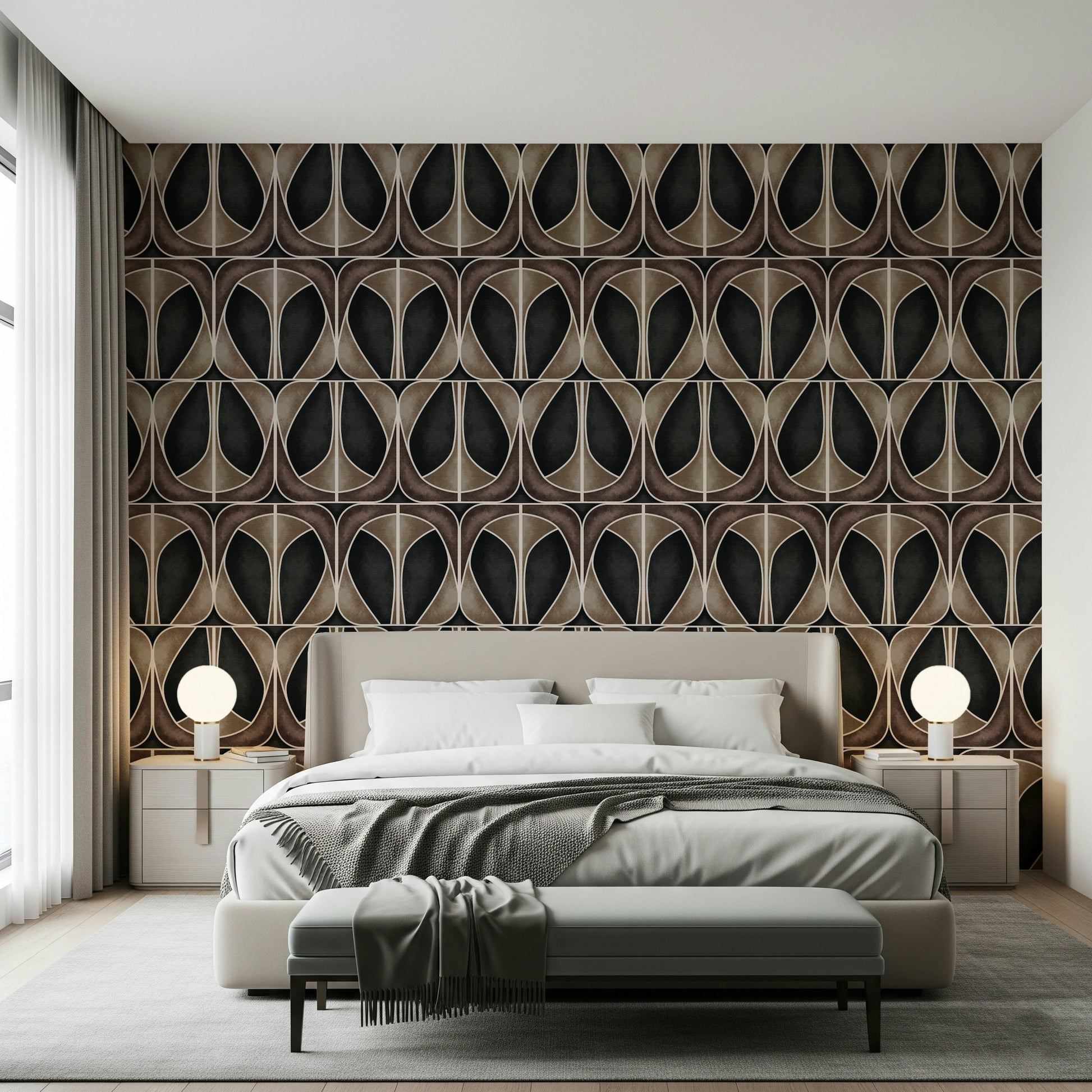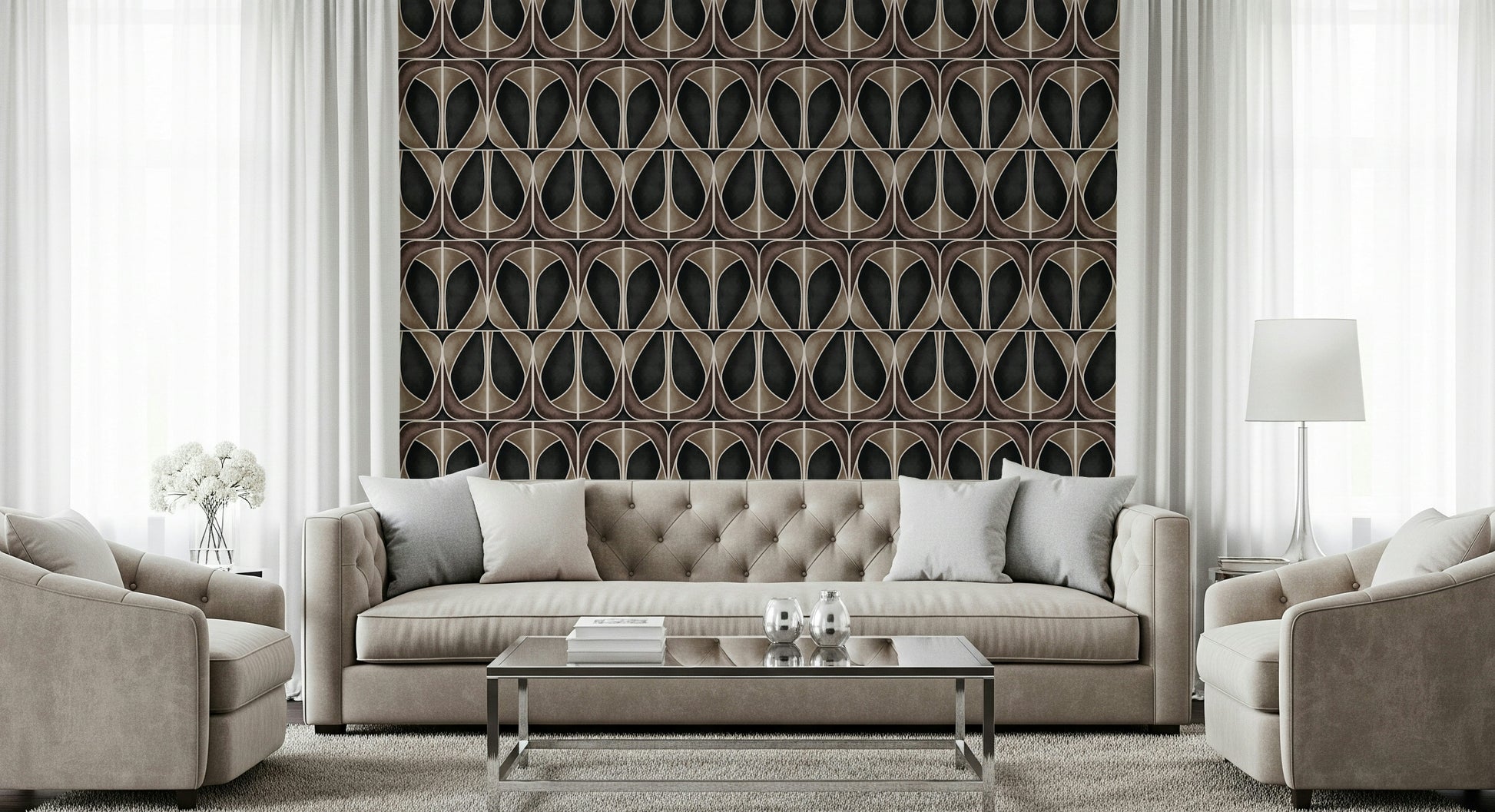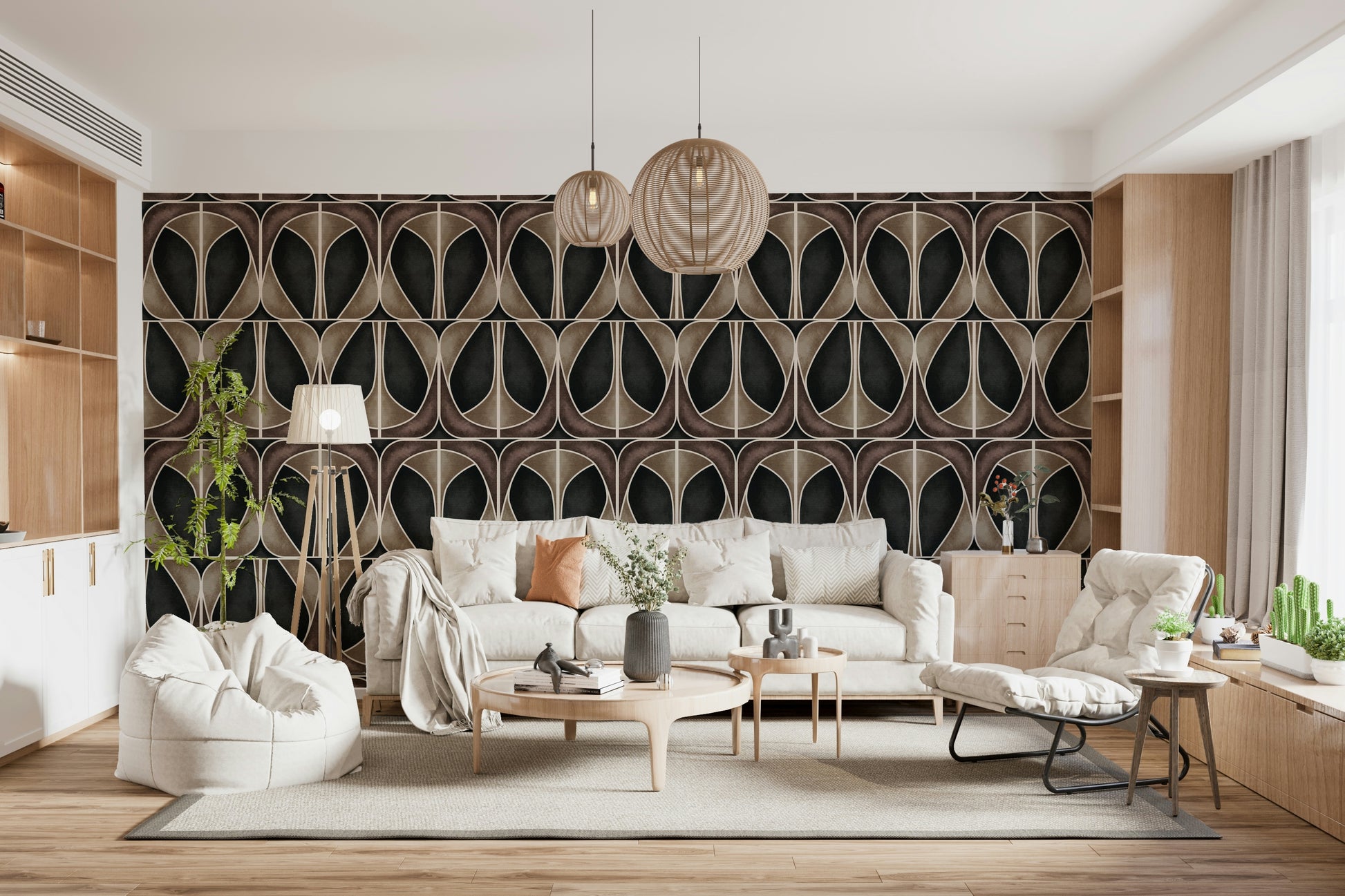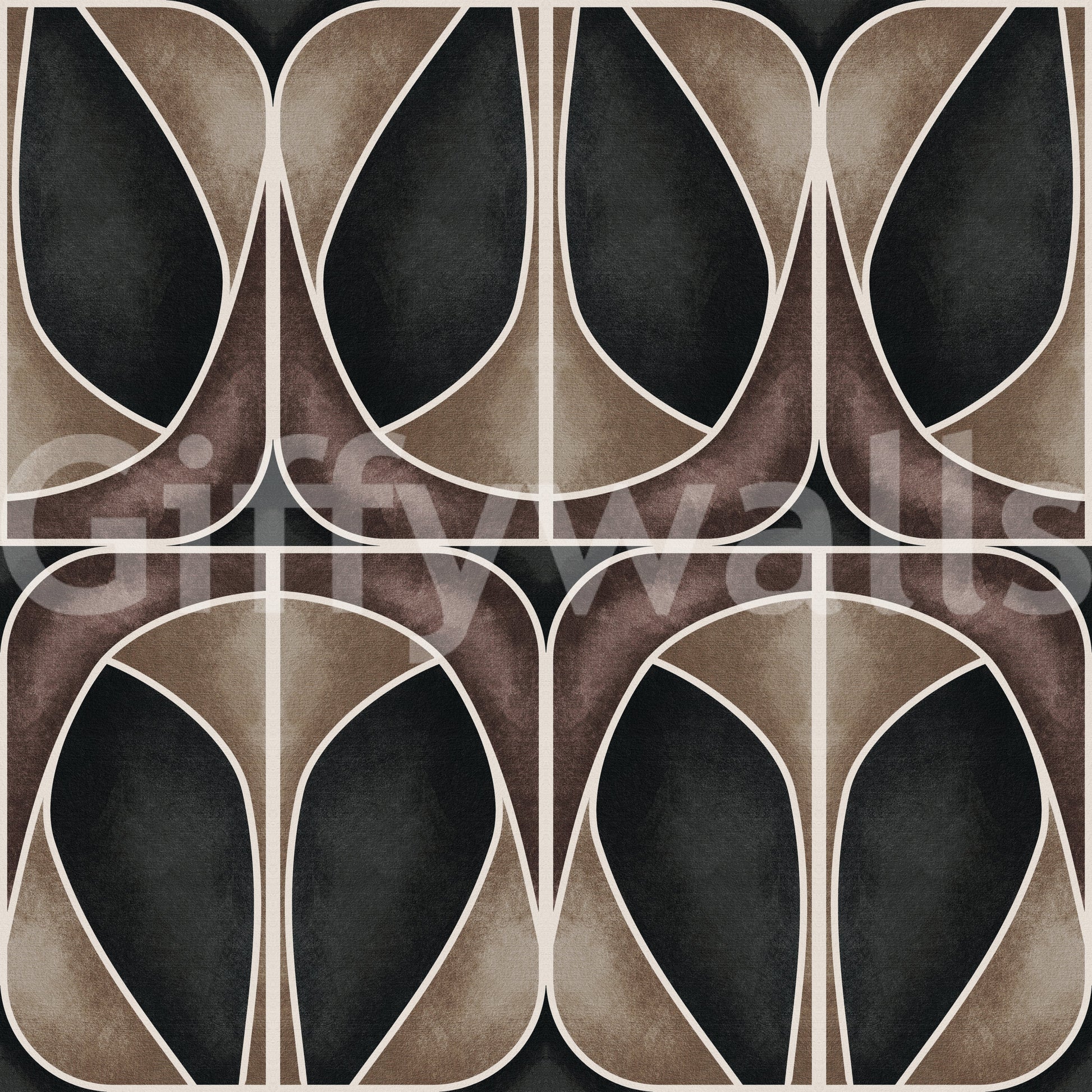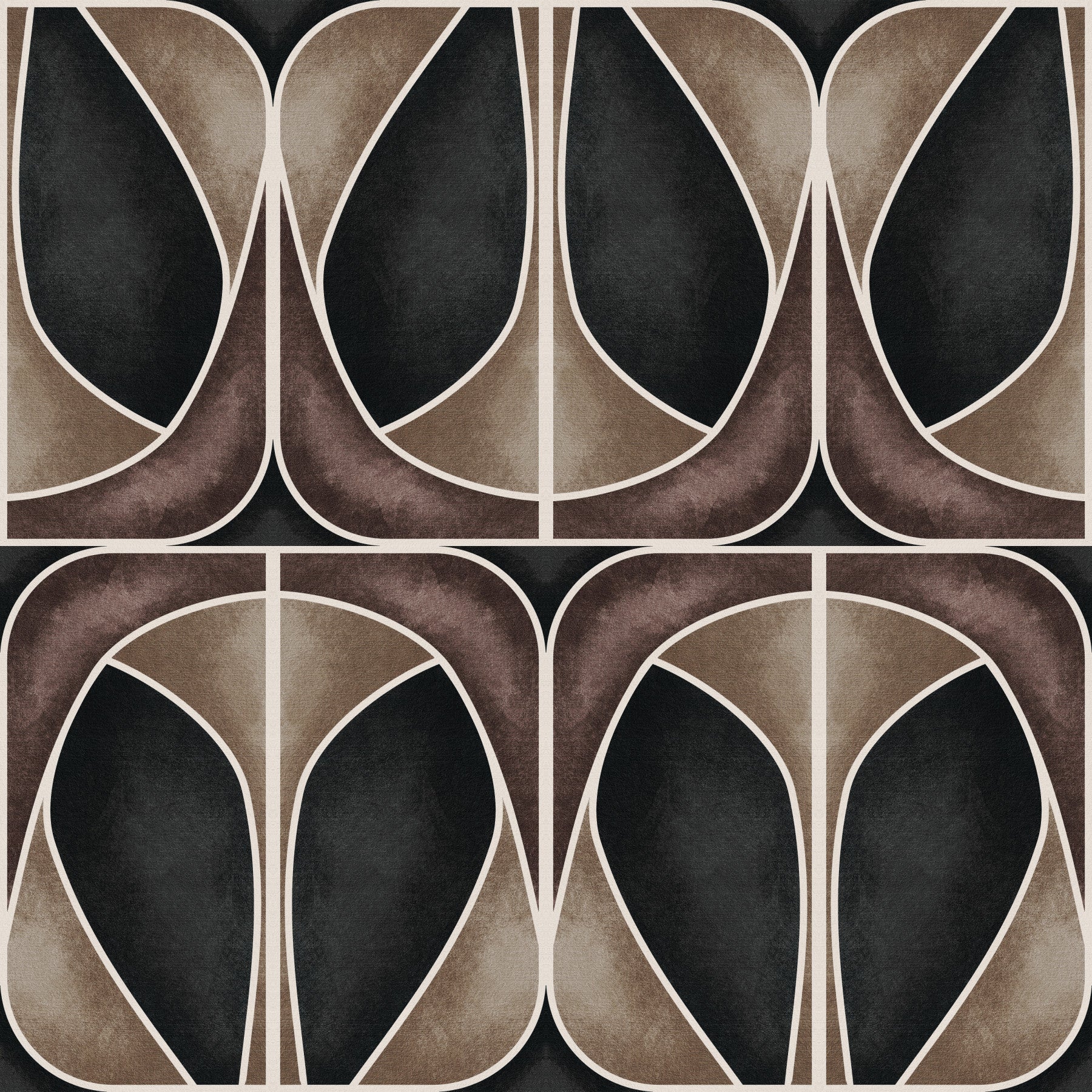 Embrace the allure of vintage sophistication with "Softy Dèco Geometries - Dramatic Charm". This wallpaper design reimagines classic Art Deco aesthetics through a lens of contemporary softness. The repeating pattern features elegantly rounded geometric shapes, rendered in a muted palette of deep charcoal blacks and warm, earthy browns. The textured effect adds depth and dimension, evoking the tactile feel of handcrafted artistry. Clean, creamy lines define the forms, creating a striking contrast that enhances the overall visual impact. More than just a decorative element, this design embodies a balance of boldness and understated elegance, perfect for transforming any space into a haven of refined style. Add a touch of glamour with it's dramatic charm.