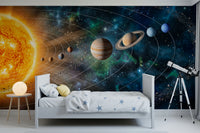 Transform any room into a cosmic spectacle with this captivating wallpaper for walls. This design features our solar system's planets orbiting a radiant sun, set against a backdrop of swirling nebulae and distant stars. The color palette moves from fiery oranges and yellows to cool blues and greens, offering a sense of depth and wonder. This wall décor brings an educational and artistic feel to kids' rooms, playrooms, or even a home office, sparking imagination and curiosity about the universe. Let this mesmerizing image expand your space and elevate your interior with a celestial touch.