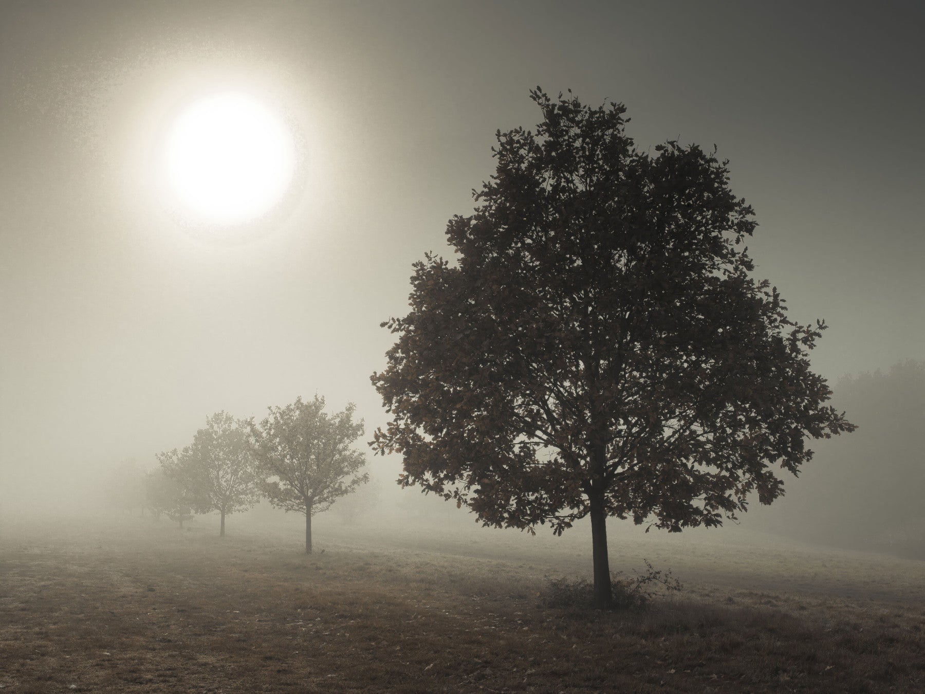 This wallpaper captures the solitary beauty of a large oak tree standing amidst a foggy field at dawn. Two smaller trees are barely visible in the distance, adding to the sense of space and quiet solitude. The soft, diffused light of the sun, partially obscured by the fog, casts a warm glow, creating a melancholic yet peaceful atmosphere. This image evokes feelings of introspection and calm, making it ideal for spaces where serenity is desired.