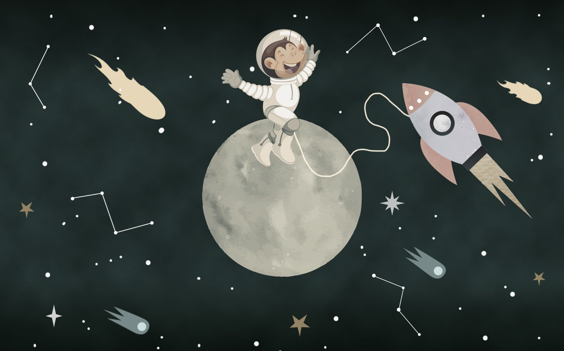 Get inspired to an intergalactic journey with Space Pup Odyssey from the mural for a kid's bedroom, and that will be the best choice. The children's space wallpaper is not only a wallpaper of entertainment to your eyes but a great source of storytelling; every night, your child will travel the galaxies with our trusty Space Pup all by themselves. From the moon's craters to distant galaxies glimmering, every aspect within the mural is designed with a question or something to learn. A cosmic playground invites the youngest minds to play, learn and grow in the presence of the stars. Invigorate your child's surrounding with this mural as a catalyst for astral curiosity!