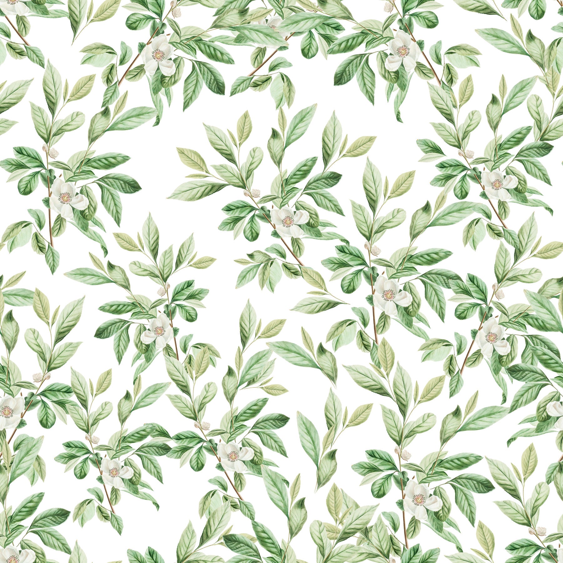 Invite nature inside with this botanical wallpaper for walls. The repeat features leaves and white flowers on a clear background. The gentle greens and whites promote relaxation, fitting for bedrooms, bathrooms, or living rooms. The pattern design complements interiors with a botanical theme and a fresh and inviting ambiance. It works well in spaces wanting a touch of nature without overpowering.