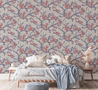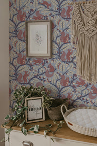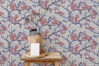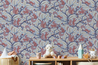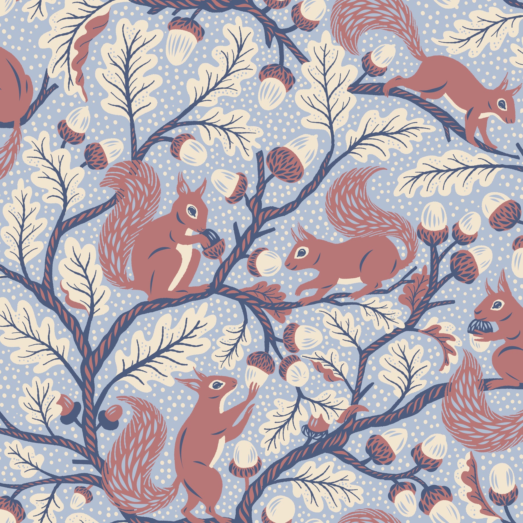 Delight in this charming wallpaper featuring playful squirrels scampering amongst the branches of a majestic oak tree. Rendered in a captivating palette of blues, creams, and muted reds, the design evokes a serene autumnal mood. Stylized oak leaves and acorns generously adorn the branches, creating a rich tapestry of natural detail. The squirrels, depicted with a whimsical touch, add a sense of lively movement and charm. Perfect for adding a touch of woodland elegance and whimsical charm to any digital device, this wallpaper offers a calming and beautiful escape to nature’s embrace.