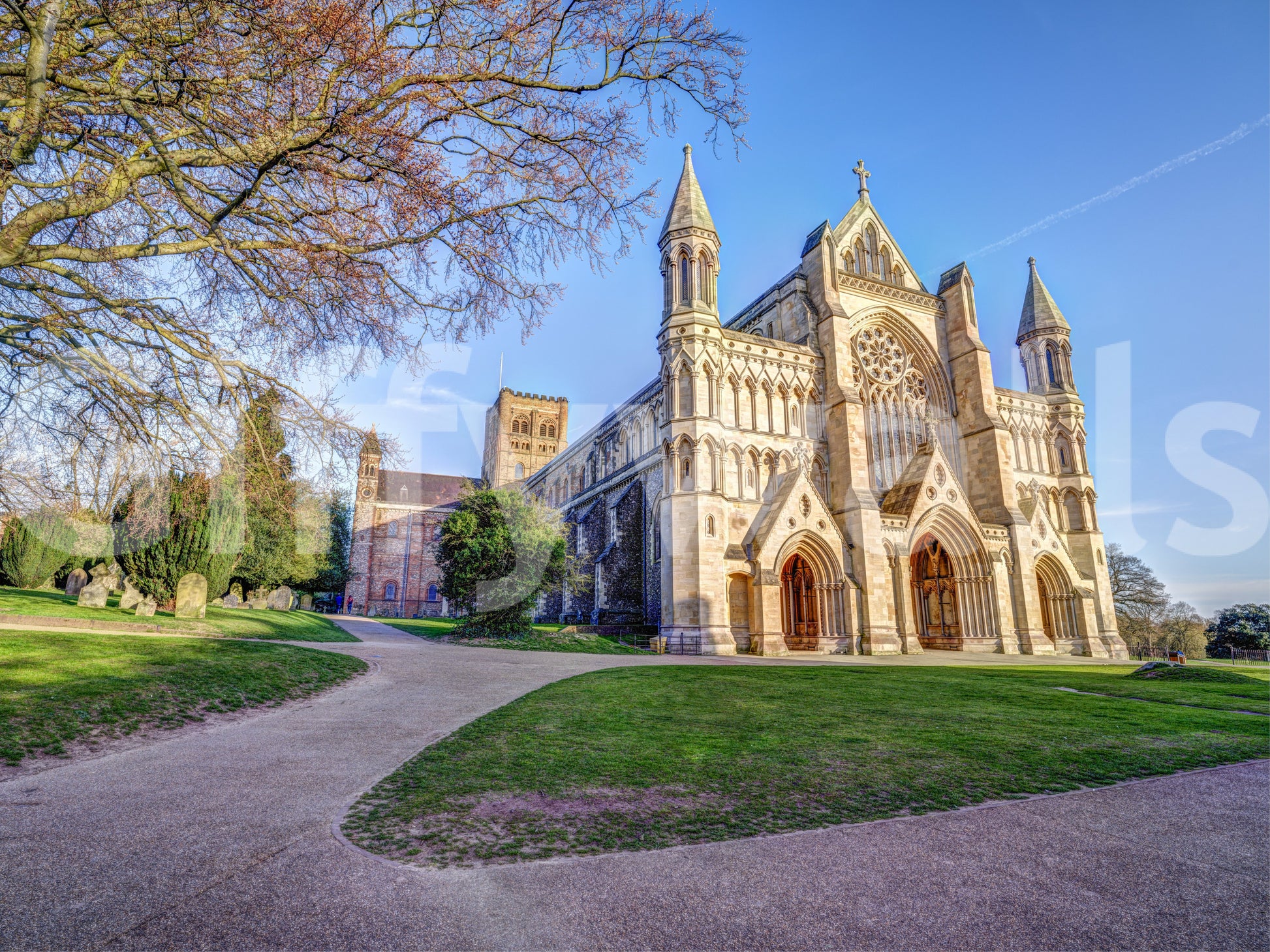 Transform your living space with the grandeur of St Albans Cathedral. This architectural wall décor showcases the iconic landmark bathed in the soft glow of sunlight under a crisp blue sky. The intricate details of the cathedral's façade, from its arched entryways to its majestic rose window, are rendered with stunning clarity, offering a sense of timeless beauty and spiritual reflection. A sprawling tree with delicate budding branches adds a touch of nature's grace, framing the historic building. The verdant lawns and meandering pathways create a sense of peace and tranquility. Enhance any room with this sophisticated piece, perfect for adding a touch of old-world charm and architectural elegance.