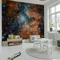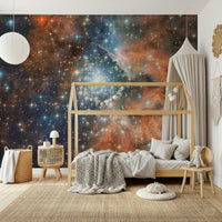 Elevate your interior design with 'Starlight Vista' wallpaper for walls, capturing the awe-inspiring beauty of a distant galaxy. This design bursts with vivid colors and intense luminosity, offering a stunning visual impact. The cosmic dust clouds in shades of blue and burnt orange create an ethereal feel. This pattern brings a dramatic, artistic flair to bedrooms, studies, and hallways. Install it as a feature wall to create a unique focal point. It evokes a sense of infinite wonder and adds a touch of otherworldly elegance to your home.