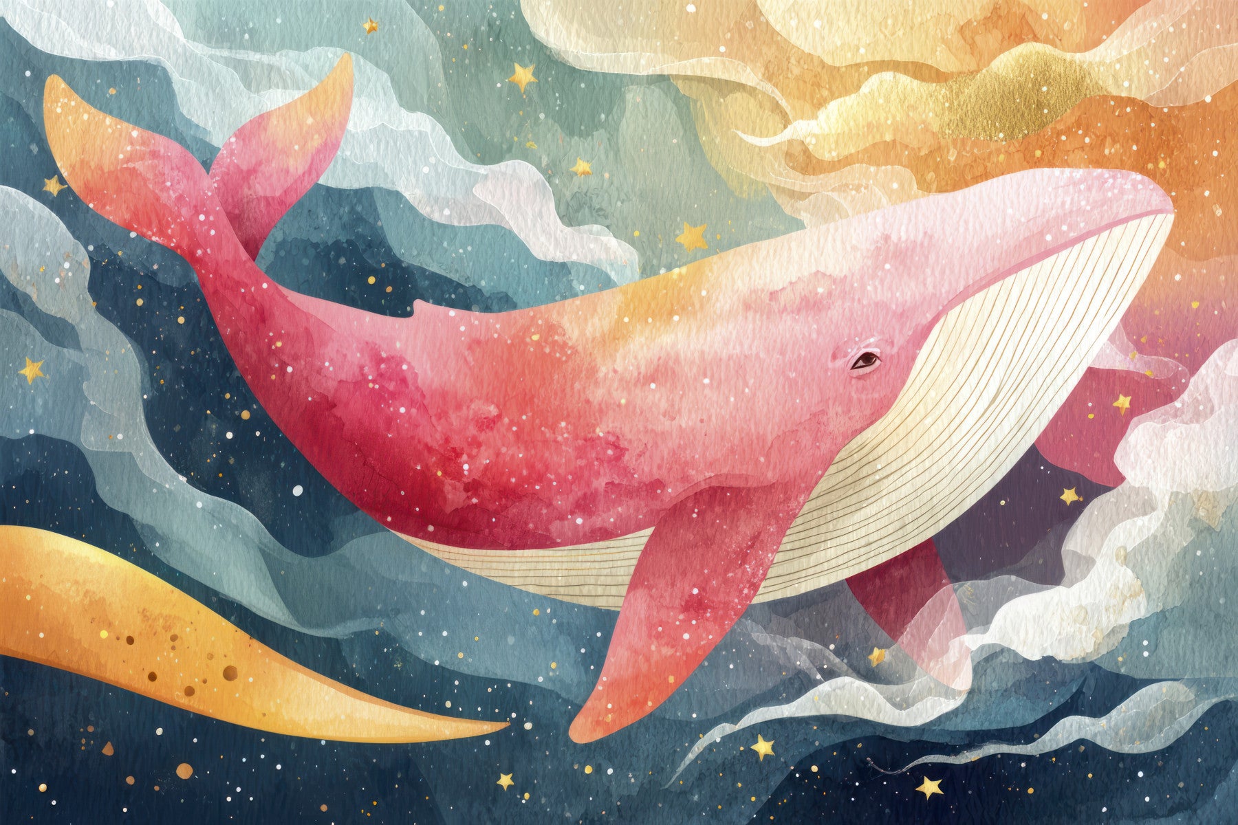 Embrace the wonder of the deep with this stunning wallpaper. A large, blush-pink whale swims through a breathtaking watercolor expanse of swirling clouds, starry skies and soft, golden light. This serene design combines the magical allure of the cosmos with the gentle beauty of marine life. The use of delicate watercolor techniques adds a touch of ethereal charm, resulting in a tranquil and inspiring atmosphere suitable for bedrooms, nurseries, or any space seeking a peaceful ambiance. The intricate detail and calming colors make it a captivating and relaxing addition to your home decor.