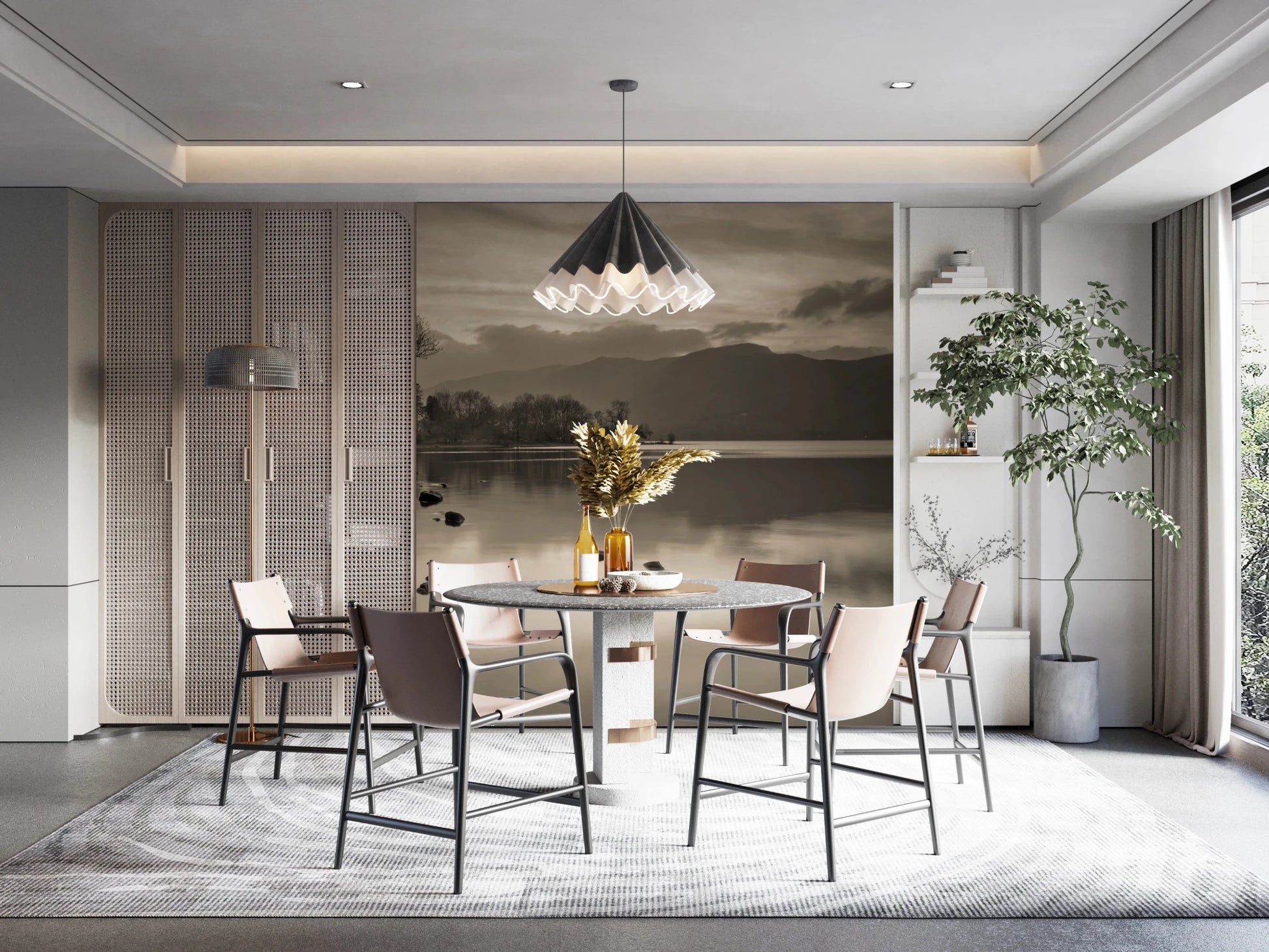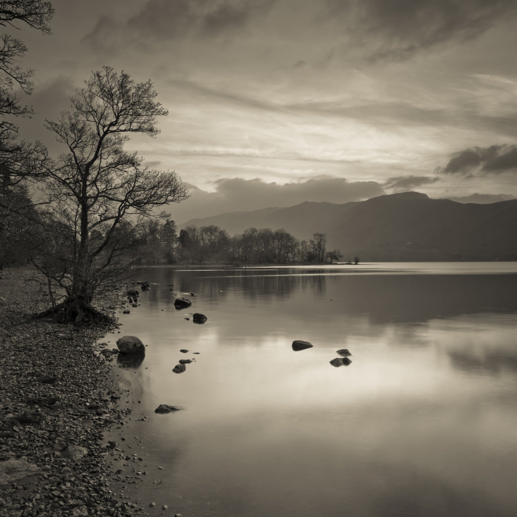 Transform your living space with this captivating sepia-toned landscape. This wallpaper for walls presents a serene lake reflecting a moody sky and distant mountains. The monochromatic color scheme in shades of beige and brown creates a calming effect, perfect for bedrooms or living rooms. Its tranquil aesthetic brings a touch of nature indoors, complementing minimalist or rustic décor. The high-resolution image ensures clarity and depth, making it a stunning focal point. Let this peaceful scene infuse your home with a sense of quiet beauty.