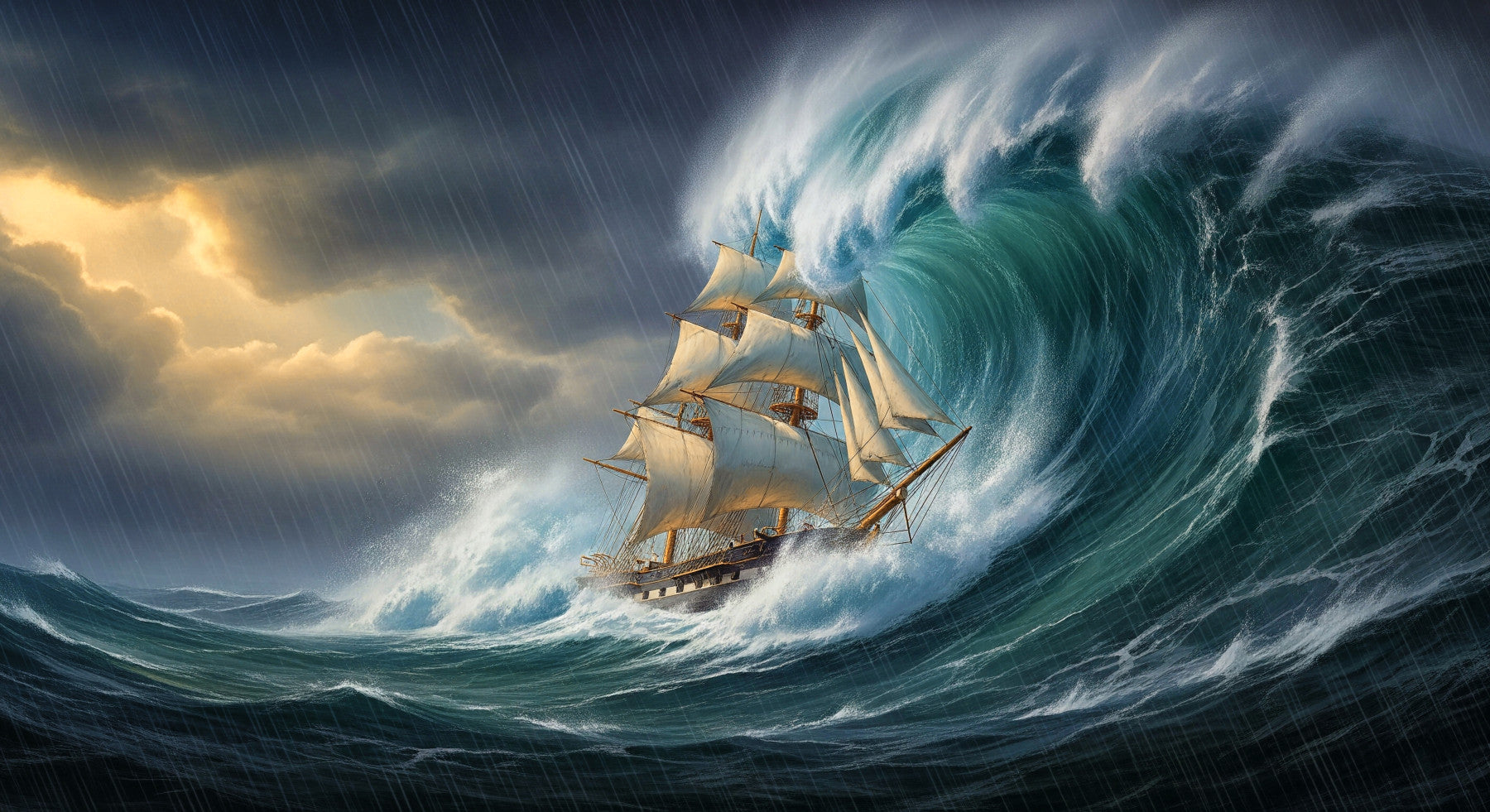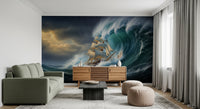 Bring the dramatic power of the sea into your home with this captivating wallpaper for walls. A majestic sailing ship battles against a towering wave, rendered in rich, dynamic detail. The turbulent water, the storm-laden sky, and the ship's courageous stance combine for a visually striking scene. The color palette features deep blues and greens with hints of gold, evoking a sense of adventure and resilience. This design suits living rooms, studies, or hallways, adding a bold statement to any interior. It enhances spaces with its dynamic composition, creates an atmosphere of maritime history, and serves as a constant reminder of the power of nature.
