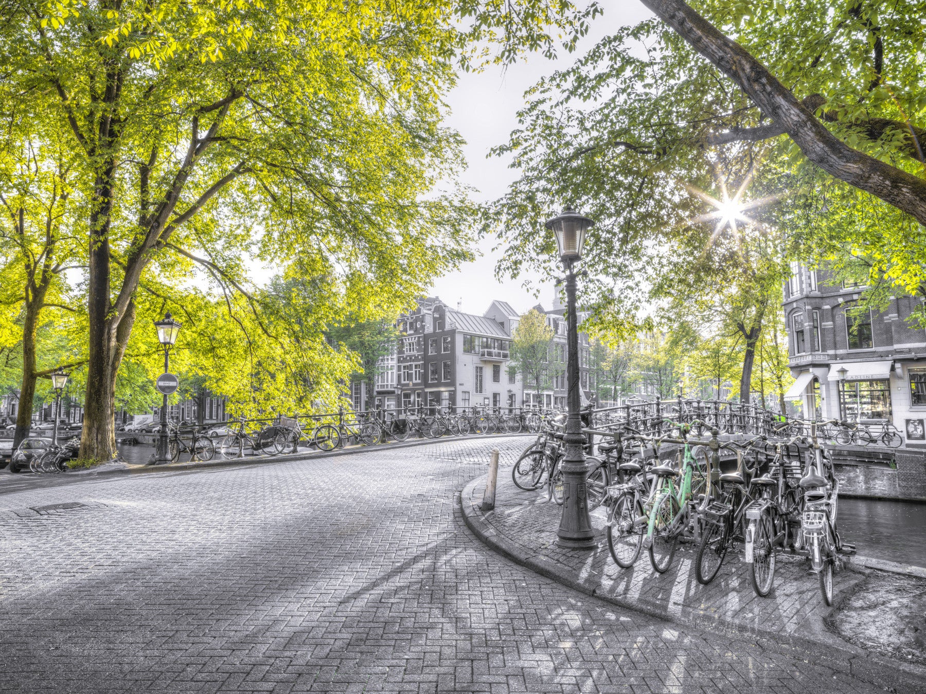 The Street of Amsterdam Wall Mural gives your home a quiet European feel. This mural wallpaper shows a sunlit street with bicycles, a canal, and classic city buildings. The unique effect, with vibrant green leaves and a bright sun against the grayscale buildings, creates a peaceful and charming atmosphere. It's an easy way to give your space a sophisticated, urban look that feels both light and full of character. This high-quality wallpaper for walls is ideal for a living room, dining area, or office.