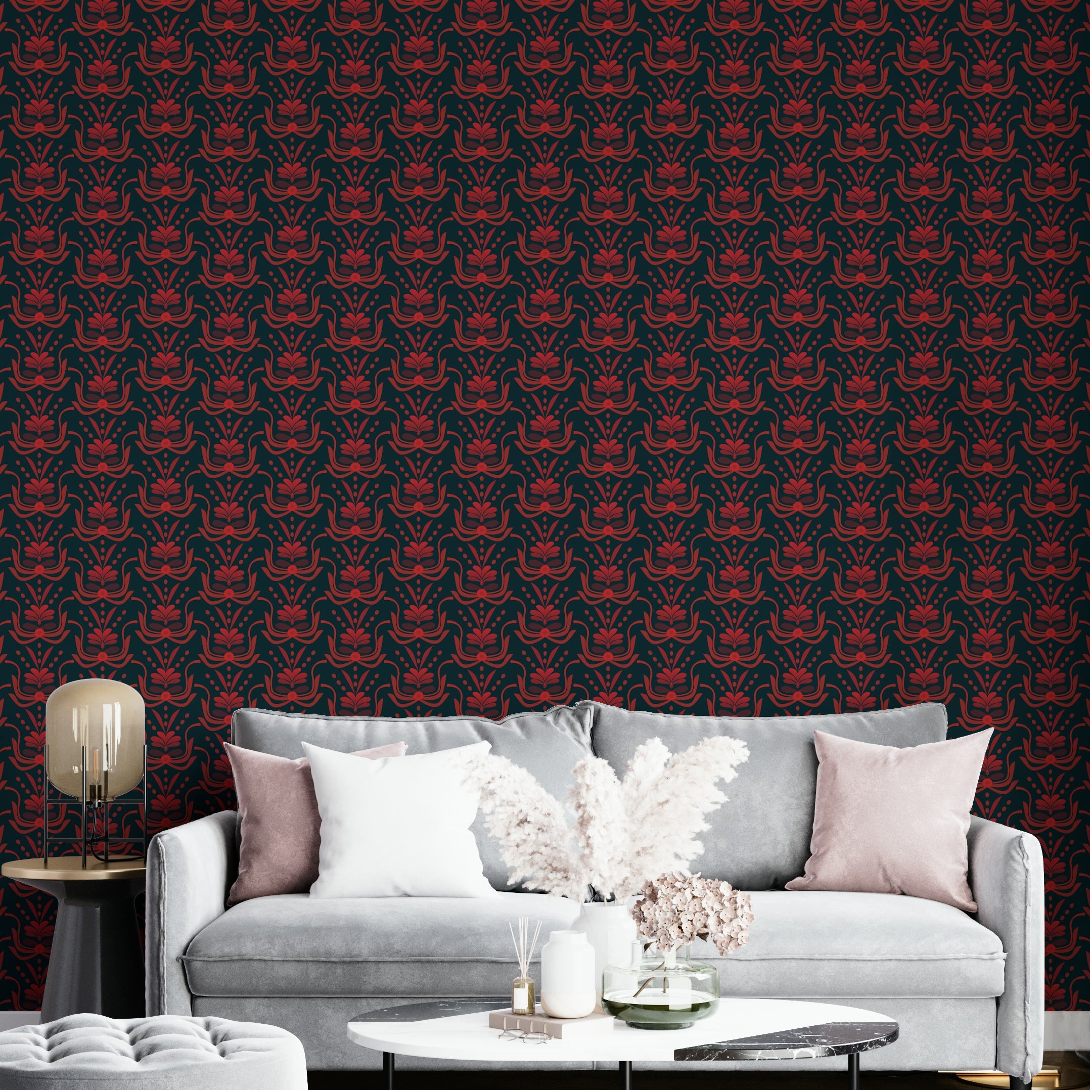 This wallpaper presents a striking stylized botanical damask pattern in a captivating palette of deep teal and vibrant crimson. The design features bold, graphic elements with a modern take on classic damask aesthetics. The repeating floral motifs create a sense of elegance and sophistication, suitable for a variety of interior design styles. The rich color contrast makes a bold statement while maintaining a sense of balance. This wallpaper will add a touch of drama and visual interest to any room, enhancing its overall style and ambiance. Perfect for those who appreciate unique and stylish home decor.