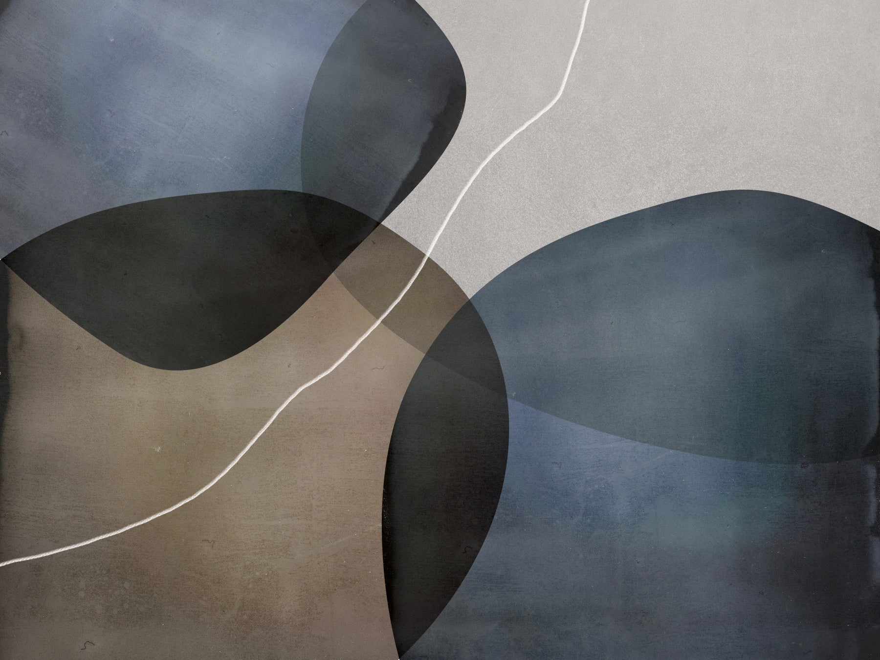 This abstract wallpaper for walls brings a fresh, contemporary feel to interiors. The design is characterized by its overlapping organic forms in neutral shades. Notice its gentle color palette of cool blues, browns, and grays, enhanced with a white line. Suited for a home office, living room, or minimalist bedroom. The sophisticated, neutral colors allow you to create a soothing ambiance.