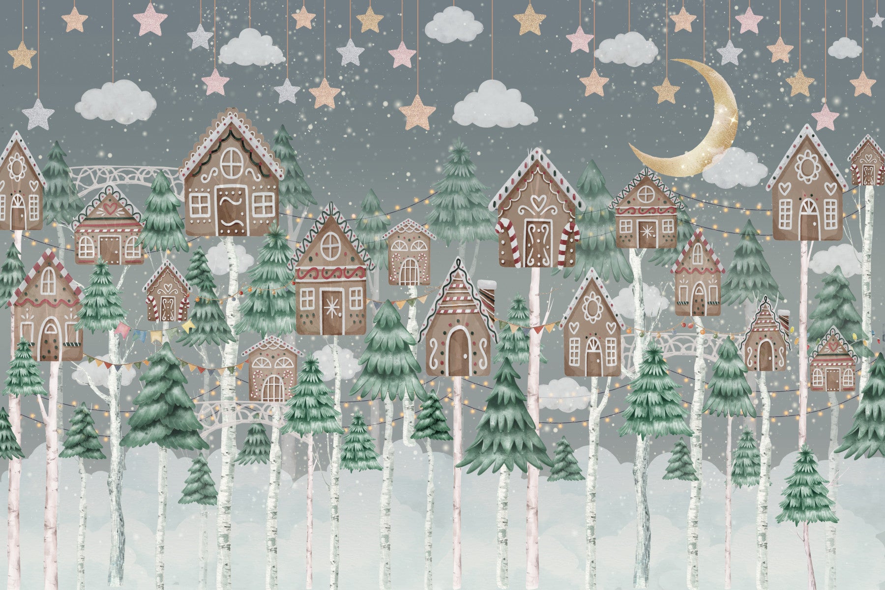 Transform your room into a magical winter village with this delightful wallpaper for walls. The image presents a whimsical scene of gingerbread houses among frosted birch trees, beneath a star-studded sky. Soft pastel colors and intricate details create a serene, dreamlike ambiance. Ideal for a kids room or a bedroom, this design adds a touch of joy to any interior. It works wonders with a soft, light style and brings charm to your home.