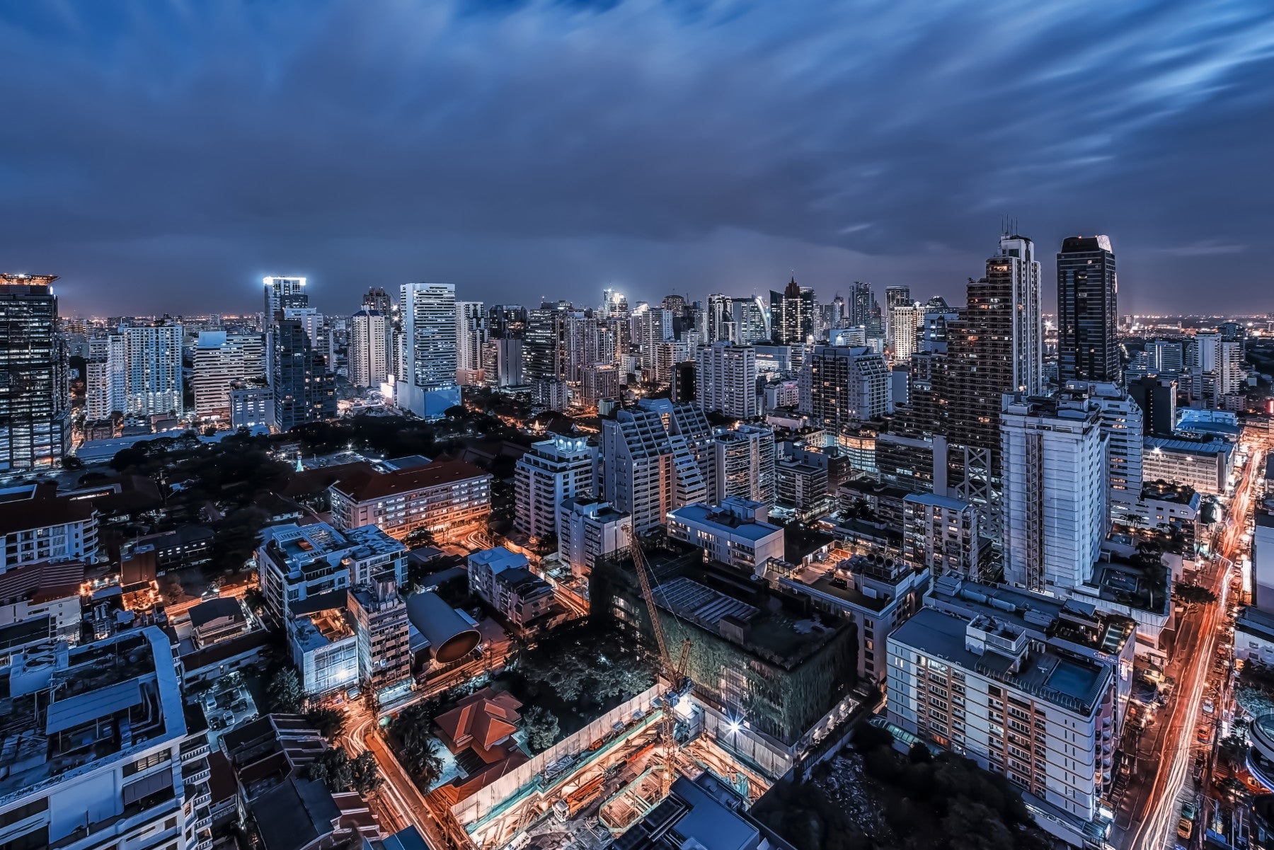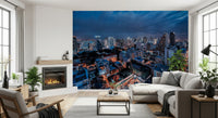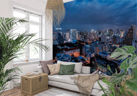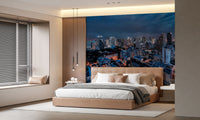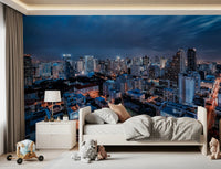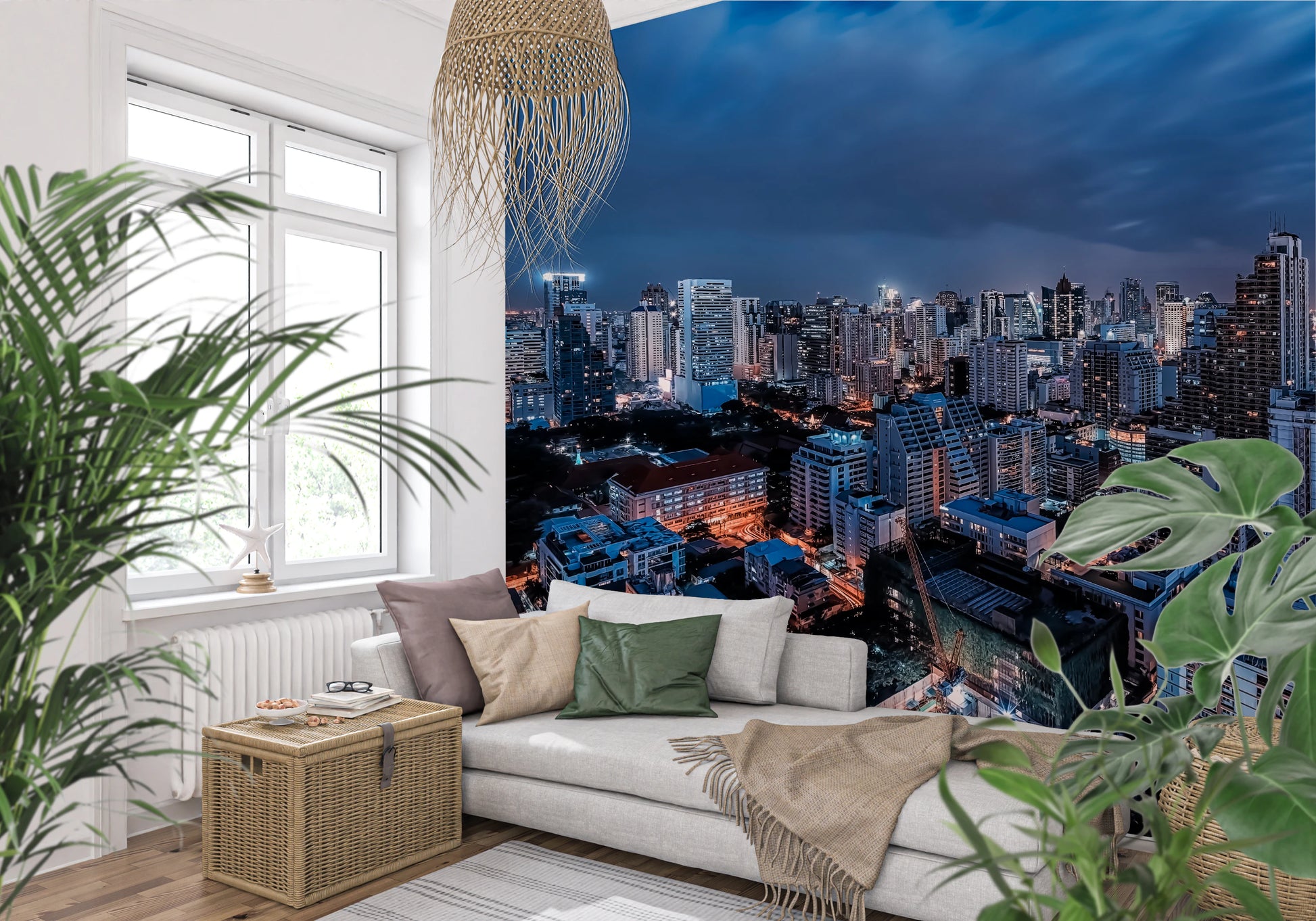 Transform your space with this captivating cityscape wallpaper for walls. Featuring a breathtaking aerial view of a bustling metropolis at twilight, the design showcases towering buildings illuminated against a dusky sky. The color palette blends deep blues and subtle oranges, creating an evocative, dramatic ambiance. Ideal for a living room or home office, this wallpaper adds depth and sophistication to any interior. The city lights, depicted as streaks of warm color, give dynamism and energy to the design. This wallpaper enhances your space with its striking urban scenery.
