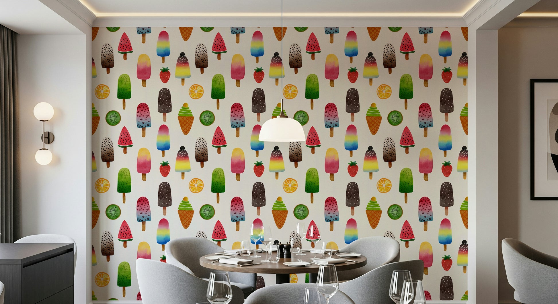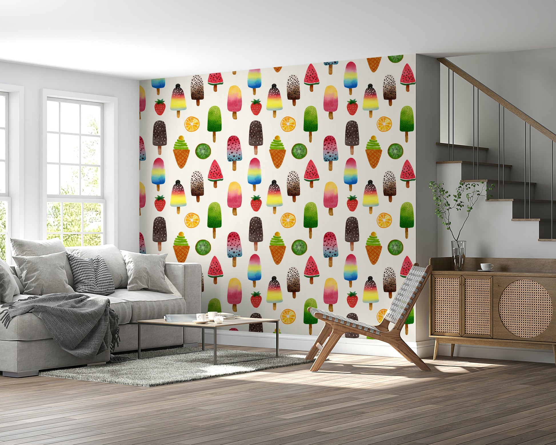 Transform your home with this deliciously delightful wallpaper for walls, featuring an array of watercolor ice pops and vibrant fruits. The playful design brings a cheerful energy to kitchens, playrooms, or even dining rooms, and it instantly livens up any space. The soft, watercolor aesthetic creates a lighthearted and inviting feel, making it perfect for both children and adults. With its colorful pattern, you can easily create a space full of joy. This seamless design makes installing the wallpaper for walls a breeze, offering a seamless finish and stunning visual impact.