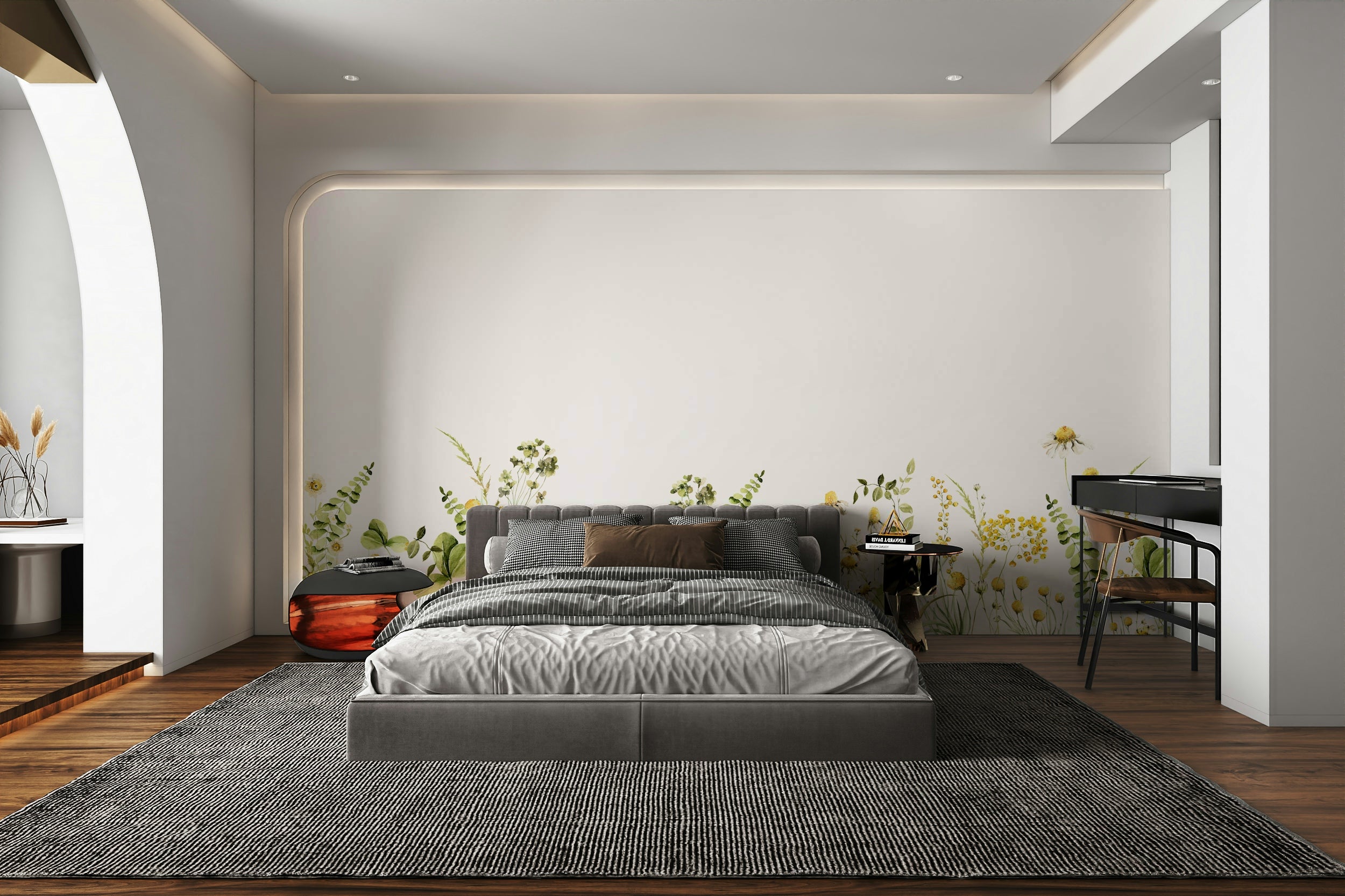 This wallpaper showcases a delicate watercolor illustration of a wildflower meadow. Delicate daisies and butter-yellow wildflowers create a serene and charming border against a crisp white background. The soft, muted color palette evokes a sense of tranquility and natural beauty, making it perfect for bedrooms, living rooms, or nurseries. The whimsical arrangement of wildflowers and foliage brings a touch of romantic elegance to any space, creating a peaceful and inviting atmosphere. The design is both sophisticated and approachable, adding a touch of subtle nature-inspired charm to your home.