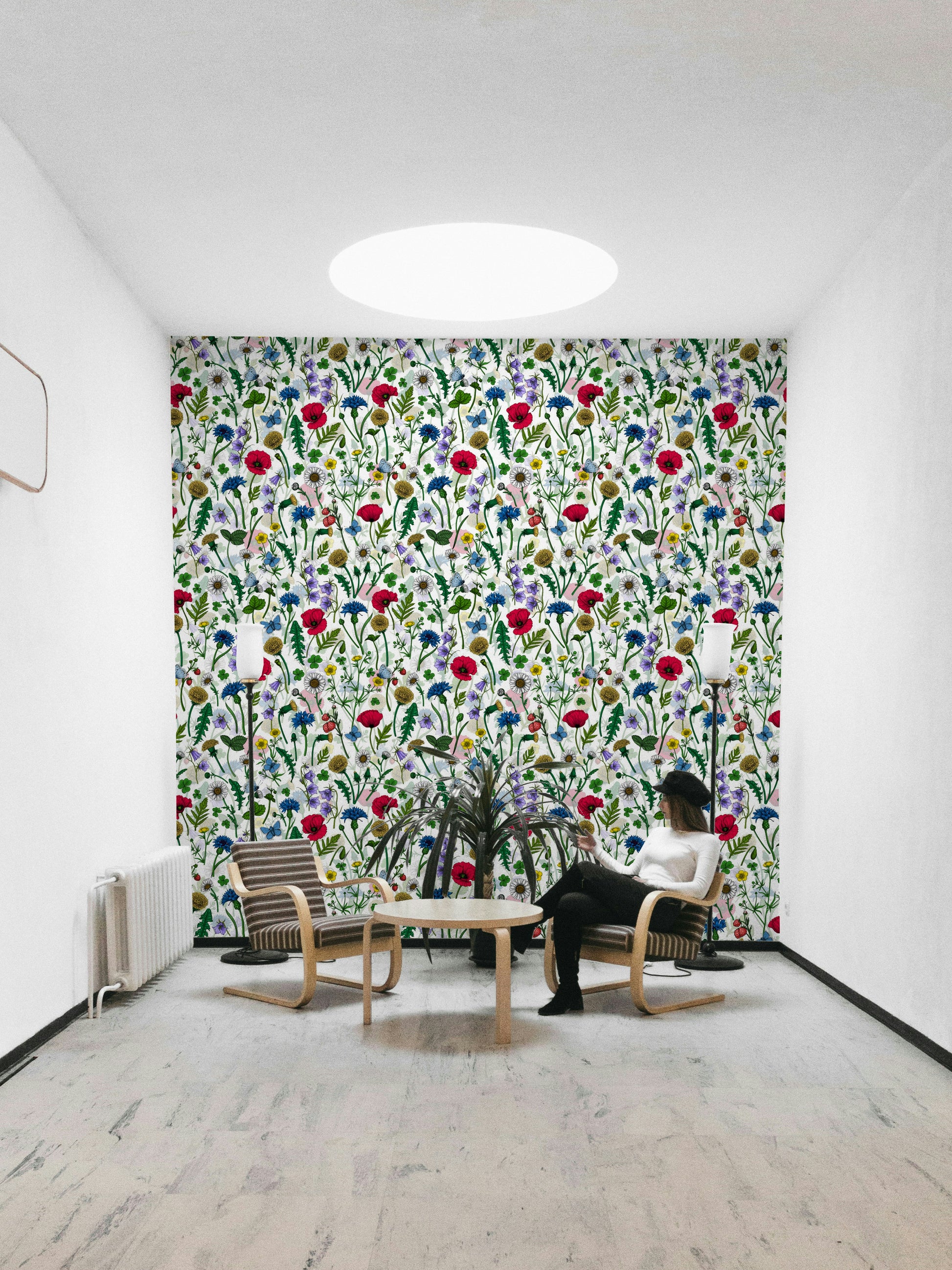 Pastel wildflowers scattered across meadow-themed wallpaper.