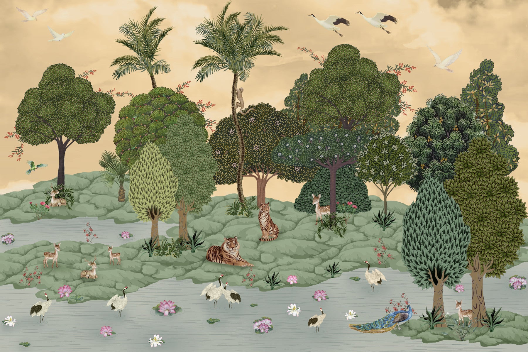 Escape into 'Sundarvan,' a serene landscape inspired by the beauty and tranquility of lush Indian forests. This captivating wallpaper features a harmonious blend of flora and fauna, showcasing majestic tigers resting amidst verdant trees, graceful deer grazing peacefully, and elegant cranes wading in a tranquil pond adorned with blooming lotus flowers. White doves and other birds grace the sky overhead, adding to the scene's idyllic charm. A playful monkey adds a whimsical touch, climbing a palm tree. The soft, warm color palette creates a calming atmosphere, perfect for creating a sanctuary within your living space. 'Sundarvan' brings the magic of the forest to your walls, transforming any room into a peaceful oasis.