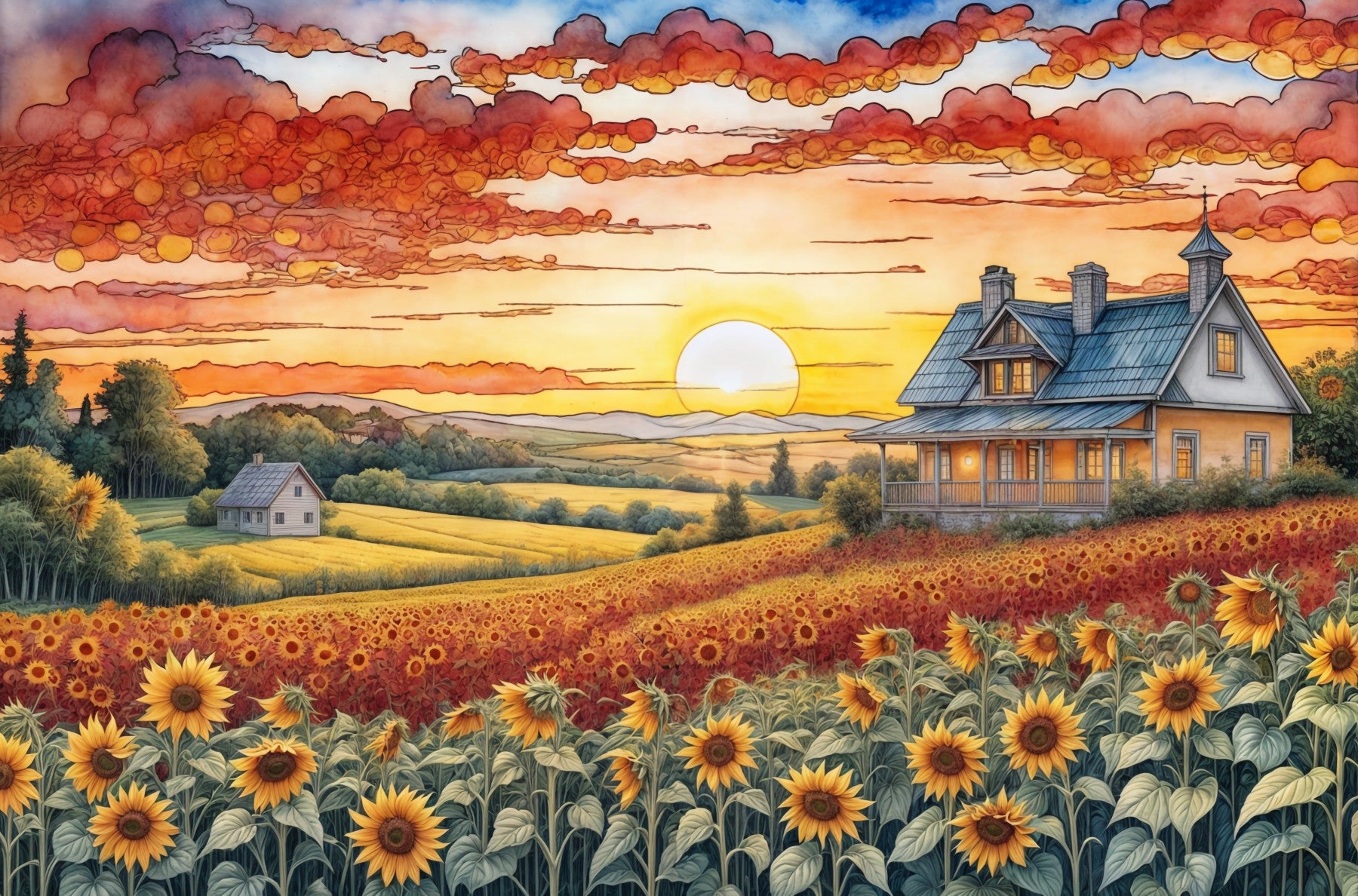 Bring the warmth of a radiant sunrise into your home with this stunning sunflower field wallpaper. The design showcases a picturesque landscape with rolling hills, charming houses, and a vibrant sunflower field bathed in golden light. The watercolor-inspired artwork features a mix of yellows, oranges, and blues, creating a calming and inviting atmosphere. Ideal for a living room, bedroom, or dining room, this wallpaper for walls complements various interior styles from rustic to farmhouse, adding a touch of countryside charm to your space.