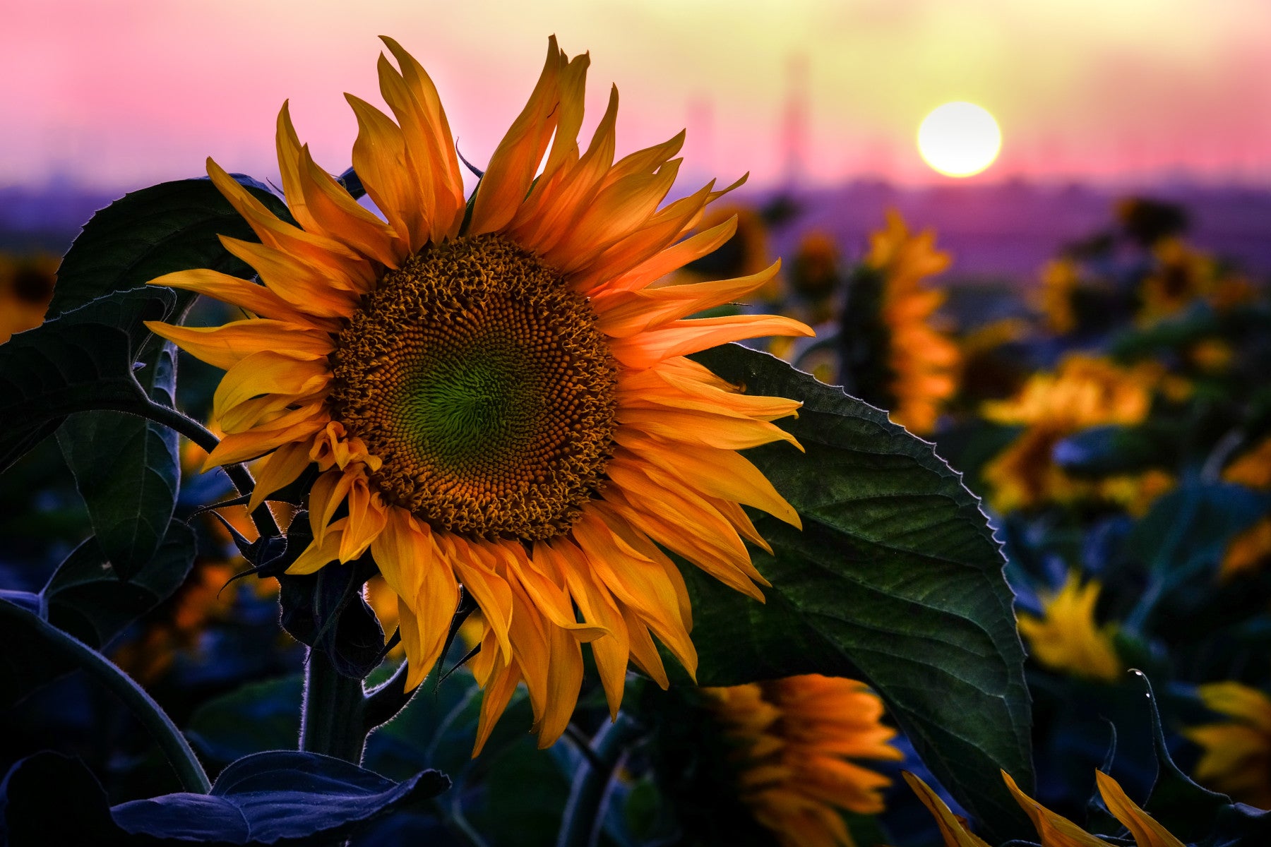 Features an expansive field of sunflowers, illuminated by the warm light of a sunset.