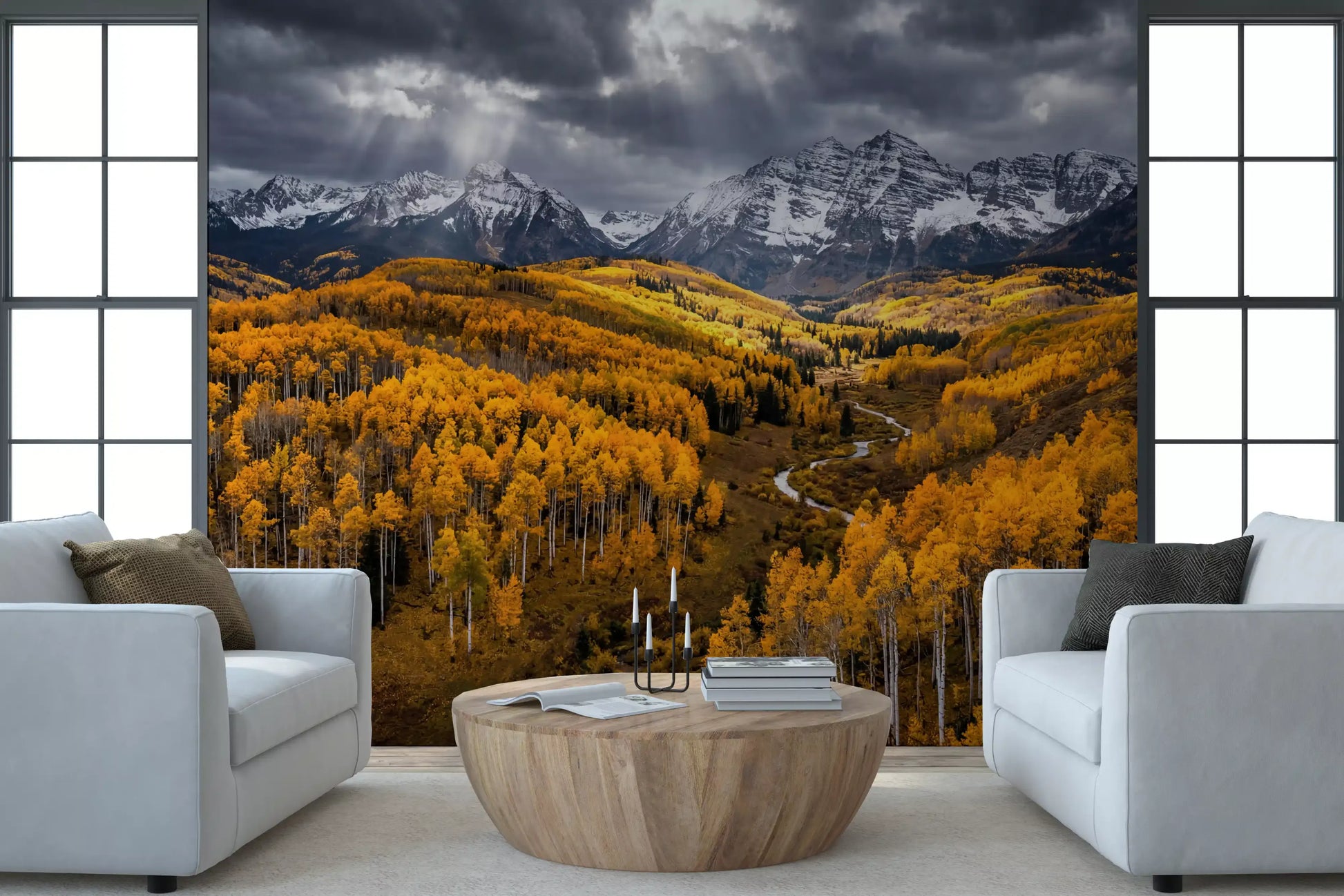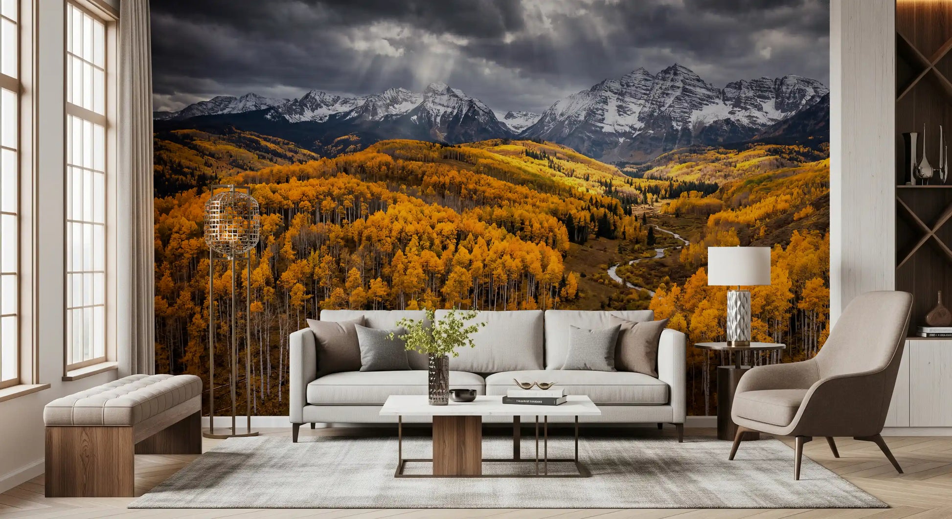 This stunning wallpaper for walls transforms any room into a majestic autumnal landscape. Vibrant golden aspen trees dominate the foreground and middle ground, creating a warm, inviting spectacle. Snow-capped mountains rise dramatically under a brooding, cloudy sky, where striking sun rays pierce through, illuminating parts of the golden valley. A winding river flows gracefully through the forest, adding a serene element to the grand vista. The rich color palette features striking golds, deep greys, crisp whites, and subtle dark greens, offering a luxurious yet earthy feel. Ideal for a living room, dining room, or a serene home office, this design complements rustic, modern, or traditional interiors by adding depth and a powerful connection to nature.