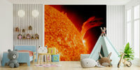 Experience the sun's fiery temper with this arresting wallpaper. Intense reds and oranges explode across the canvas, offset by the inky black of space. This bold choice makes a strong impression and would work well as wallpaper for walls in a home office or modern loft. The design enhances interiors with its dramatic flair, injecting energy and character. Let the fiery colors inspire you. It suits minimalist interiors too, providing a focal point.