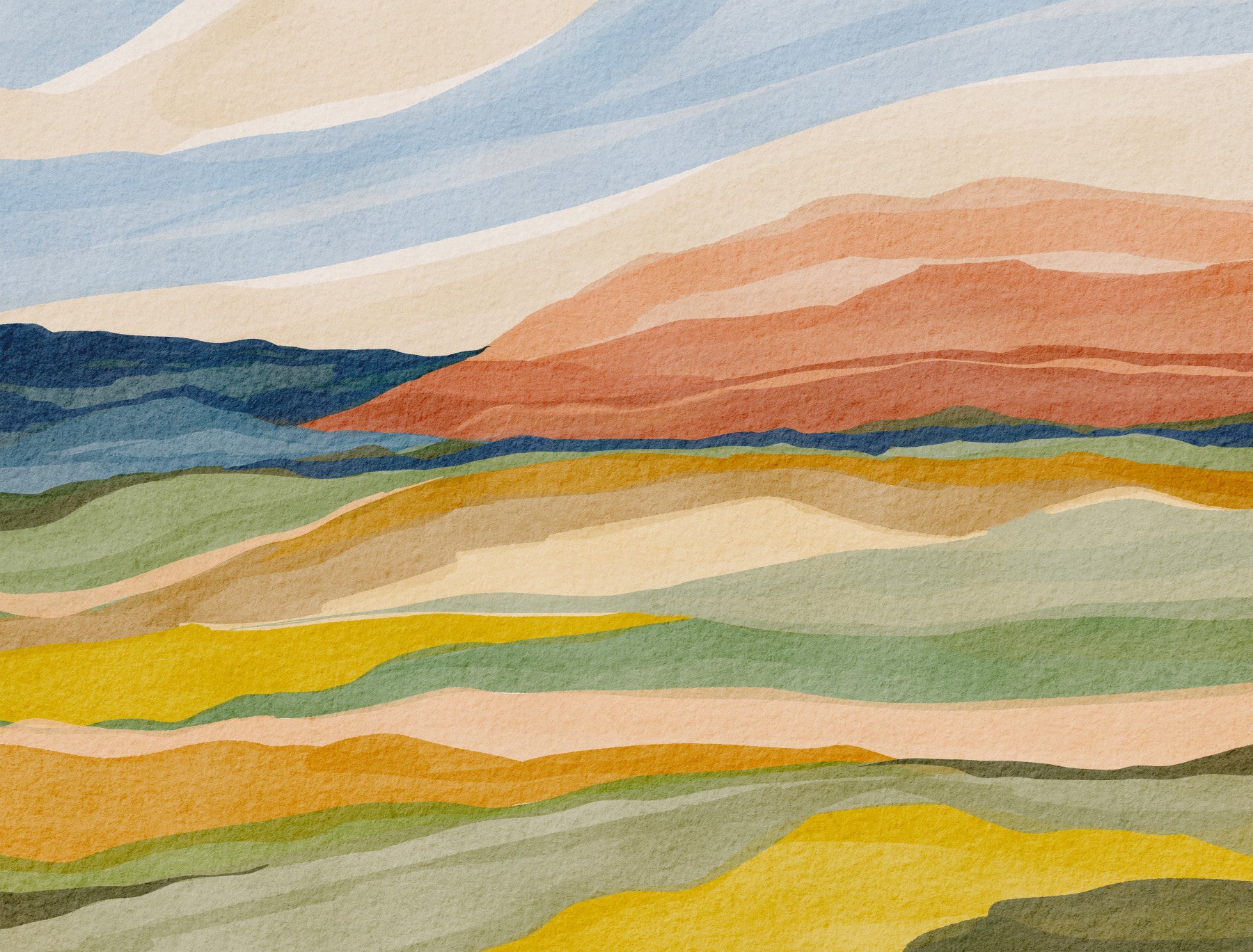 Capture the golden hour with this breathtaking wallpaper. The image features a stylized sunset over rolling hills, painted in a soft, almost impressionistic style. The warm hues of orange, yellow, and terracotta blend seamlessly with cooler blues and greens, creating a balanced and harmonious composition. The painterly texture adds depth and visual interest, while the overall mood is one of calm and peaceful contemplation. Perfect for adding a touch of nature-inspired elegance to any room.