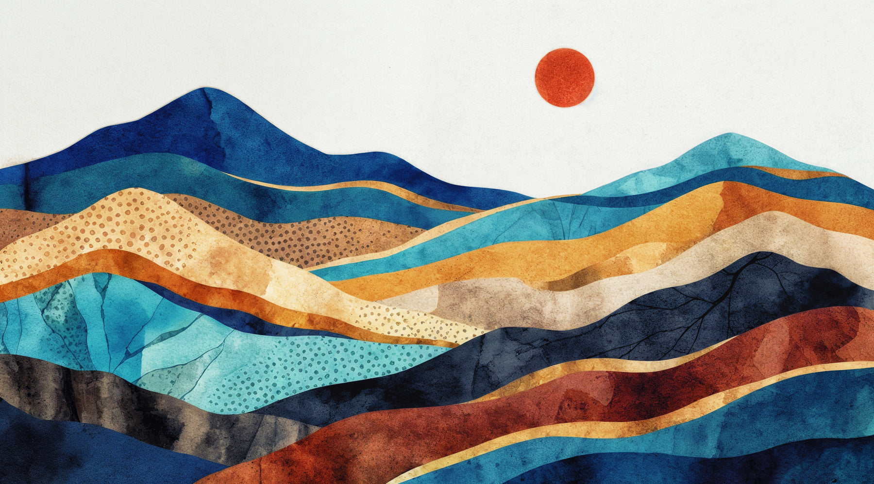 Elevate your home with this serene Sunset Vista wallpaper for walls. The design presents abstract hillsides in rich watercolor textures, layered in complementary shades of blue, gold, and terracotta. A vibrant orange sun adds a focal point, creating a balanced composition. This wallpaper offers a sophisticated way to bring the beauty of nature indoors. Ideal for dining rooms, hallways, or bedrooms, it provides a tranquil backdrop that enhances the natural light in your space. This wallpaper pairs well with modern and classic decor.