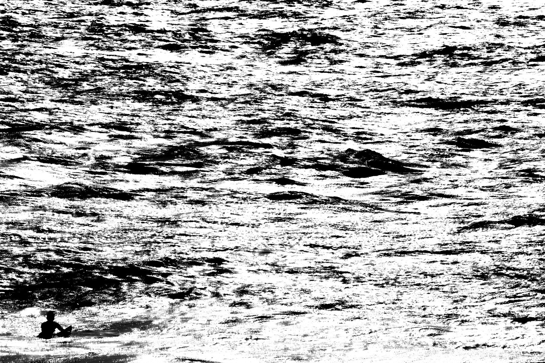 Immerse yourself in the raw, untamed energy of the ocean with "Surf," a striking black and white wallpaper. This evocative image captures the dynamic dance of sunlight and shadow on the water's surface, creating a mesmerizing pattern of textures and forms. Feel the relentless power of the waves as they ripple and crash, a testament to nature's enduring strength. In the foreground, a lone figure sits facing the ocean, an intimate detail adding a sense of scale and contemplation. This minimalist yet powerful composition brings the essence of the surf to your screen, offering a daily dose of tranquility and the wild, captivating spirit of the sea. Perfect for those who seek inspiration and serenity in the vastness of the ocean.