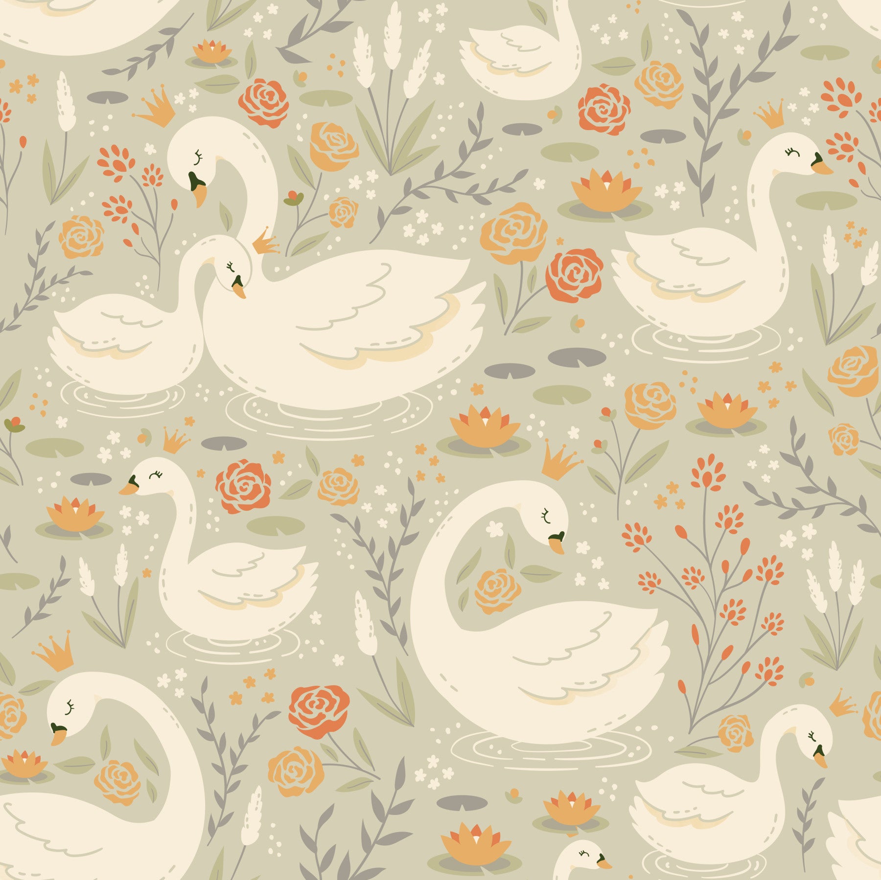 Swan Lake Dreams Wallpaper pattern featuring white swans, water lilies, and pale orange roses on a sage background.
