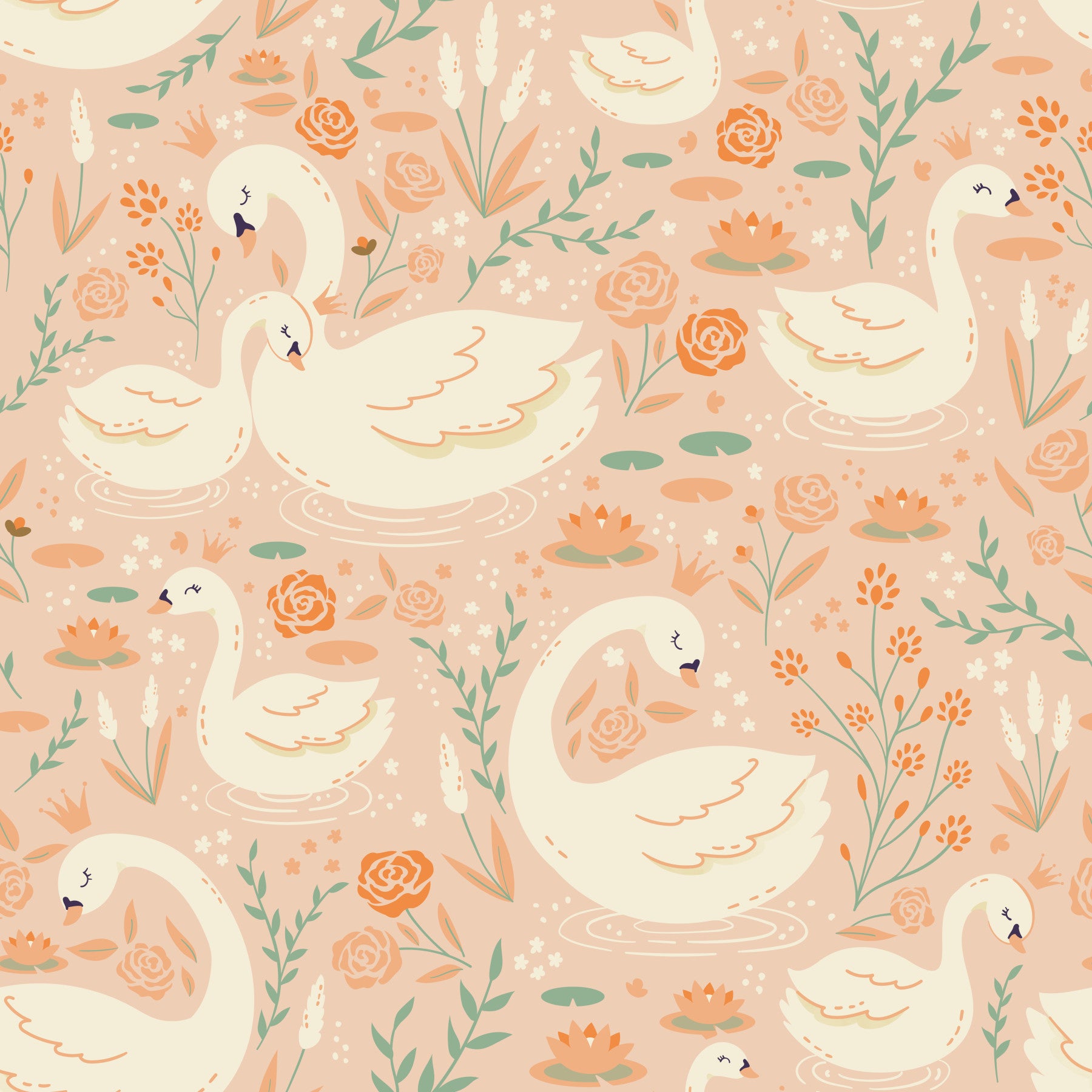 Drift into a serene world with this charming swan and floral design. Gentle peach hues create a warm and inviting atmosphere. Elegant swans float among stylized roses, water lilies, and delicate foliage. Perfect wallpaper for walls in a nursery, bedroom, or playroom, this pattern adds a touch of whimsy and sophistication. The soothing color palette and detailed illustrations will complement both modern and classic interiors, creating a peaceful sanctuary.