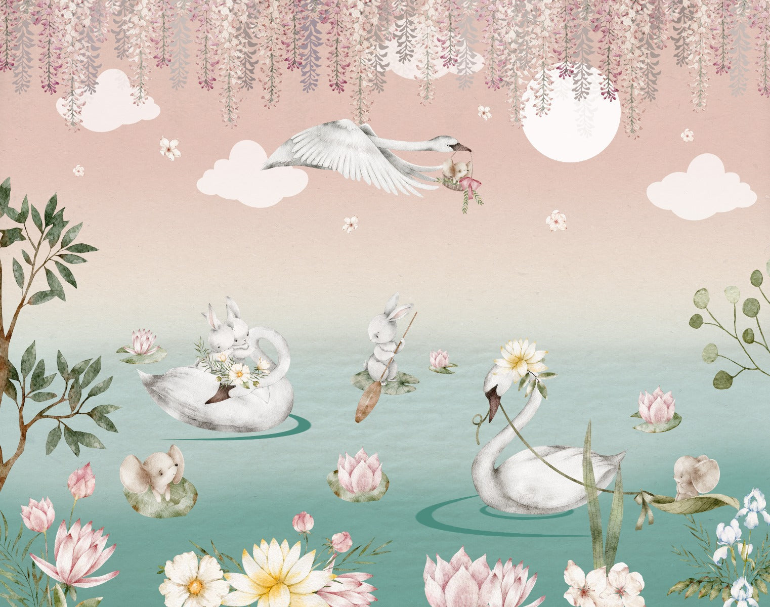 Transform a child's room into a magical lagoon of whimsical wonder with this spellbinding swan lake mural. Designed as a dreamer's kids' room or playground wall, the children's wallpaper is a calm meadow with swans and rabbits around water lilies and a bubblescape. Soft, pastel colours: It has been enchanted by her soft charm that would be perfect for storytelling and play. Enthusiasm for creativity and nature in your child with this enchanting kids' room wallpaper. Build a place to grow that is like a different fairy tale every day! Jump in and take the reigns of their world with a pixie-dusted backdrop that'll lift their spirits and inspire creativity.
