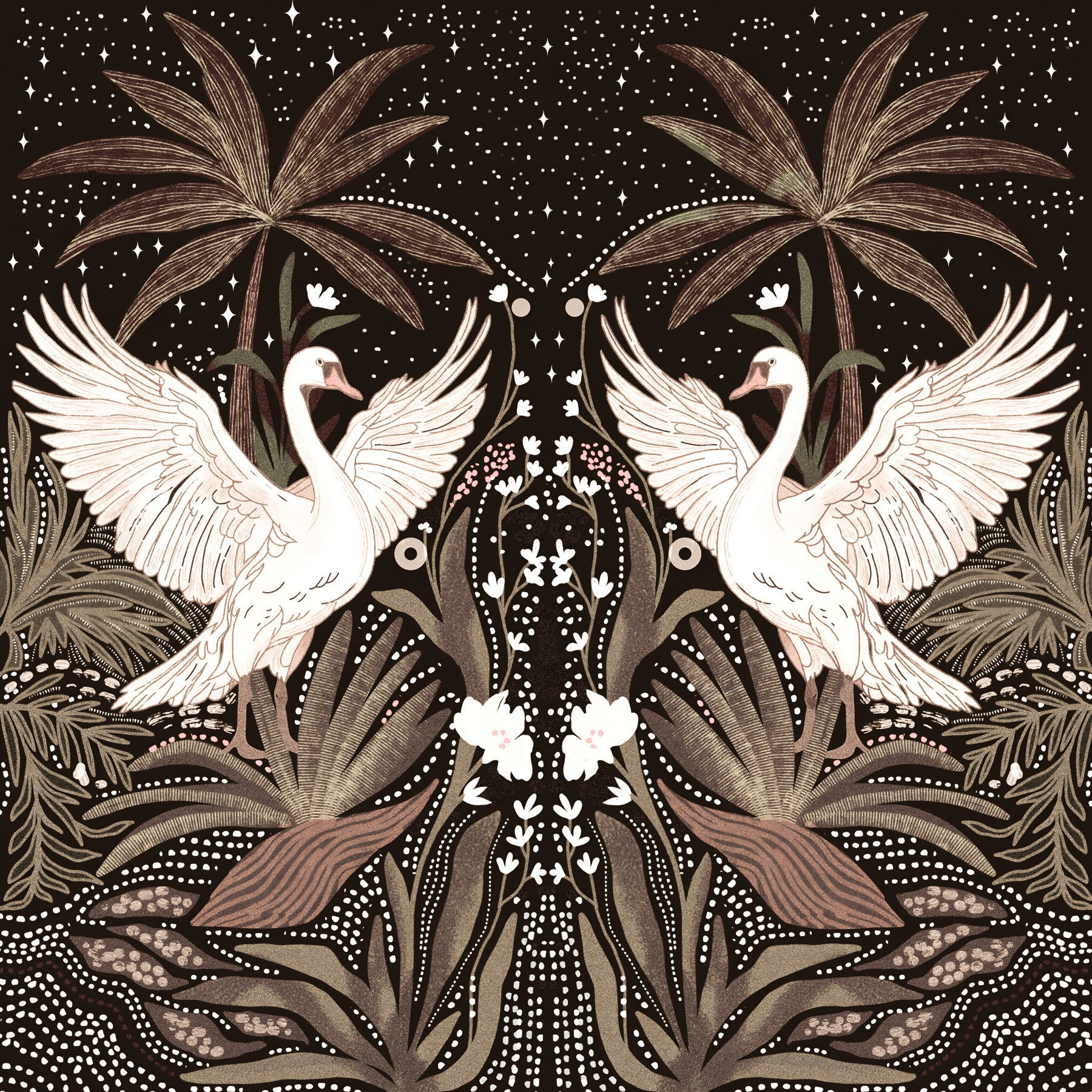 Symmetrical art, midnight garden, Swan Nightfall Serenity peel and stick wallpaper.