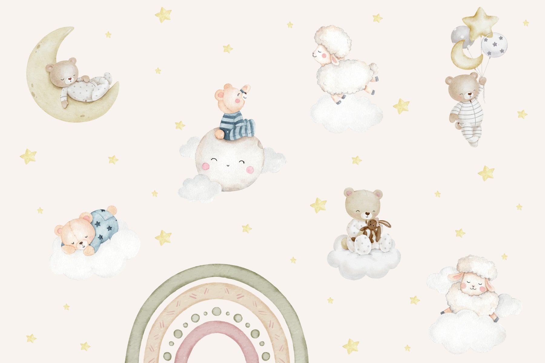 Transform your nursery into a haven of sweet dreams with this adorable wallpaper for walls. The watercolor design showcases sleeping teddy bears and fluffy sheep floating on clouds, all under a soft rainbow. Its pastel hues of pink, beige, and green create a calming atmosphere. This mural design complements nurseries, kids' rooms, and even playrooms, promising to add a touch of whimsy and peace to your child's space.