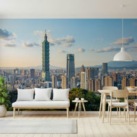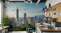 Capture the beauty of Taipei's skyline with this stunning wallpaper for walls. It features the iconic Taipei 101 surrounded by lush greenery and a soft, calming sky. The design brings a sense of peace and wonder to any room. The soft blues and greens promote a tranquil atmosphere, making it ideal for bedrooms, living rooms, or even a home office. Let this breathtaking view transform your space into a serene urban oasis. It elevates interiors with sophisticated calm.