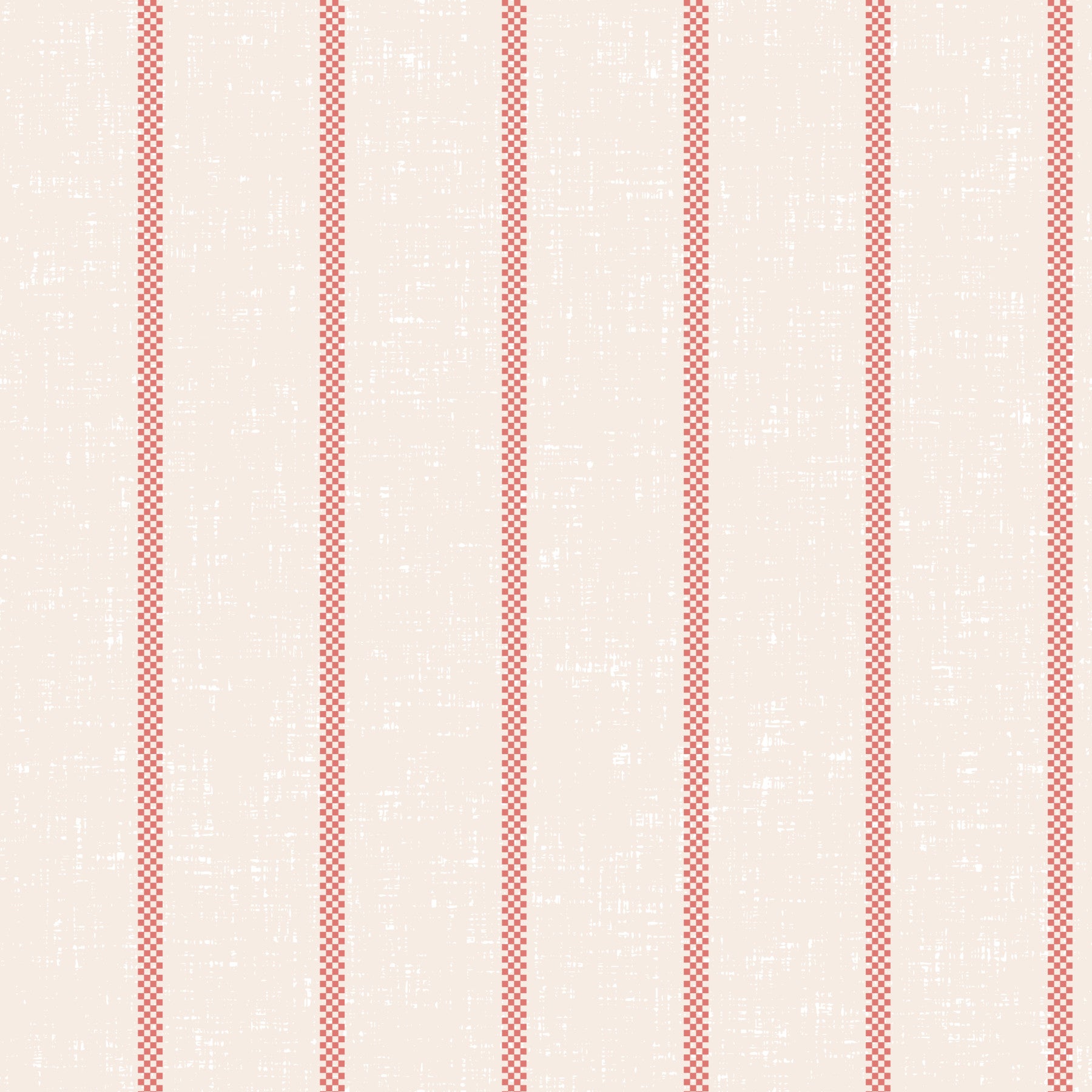 Embrace a touch of rustic charm with this 'Tea Towel Stripe - Red' wallpaper. The design features delicate, vertically-aligned stripes of a soft coral red checkerboard pattern, set against a subtly textured, off-white background. This understated yet stylish wallpaper evokes the cozy feeling of a vintage tea towel, bringing a sense of warmth and simple elegance to any space. The slightly distressed background adds depth and character, enhancing the overall homely and inviting atmosphere. Perfect for kitchens, bedrooms, or any room needing a touch of refined country style.
