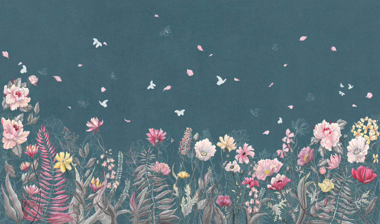 This botanical wallpaper blends delicate floral artistry with a rich teal backdrop, creating a balanced mix of elegance and nature. Hand-drawn flowers in soft pinks, yellows, and neutrals bring a refreshing contrast, while subtle butterflies and floating petals add movement. Perfect for bedrooms, living spaces, or feature walls, this design introduces a timeless floral aesthetic. Crafted with high-quality materials, it offers a durable and refined finish. Whether used in classic or modern interiors, this botanical wallpaper infuses a space with organic charm and graceful sophistication, making it a captivating choice for those who appreciate nature-inspired patterns.