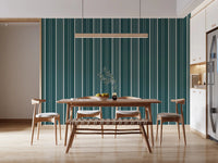 Add modern sophistication to your interior with this vertical stripe wallpaper for walls. The simple design features distinct lines of dark teal and off-white, creating a visually appealing pattern. This wallpaper gives any room a sense of spaciousness and height. It works well in bedrooms, living areas, or hallways, contributing to a stylish and peaceful environment. The versatile aesthetic blends seamlessly with minimalist or contemporary furnishings, adding a dash of understated luxury. Revamp your space quickly by mounting it, and you will get a sophisticated look.