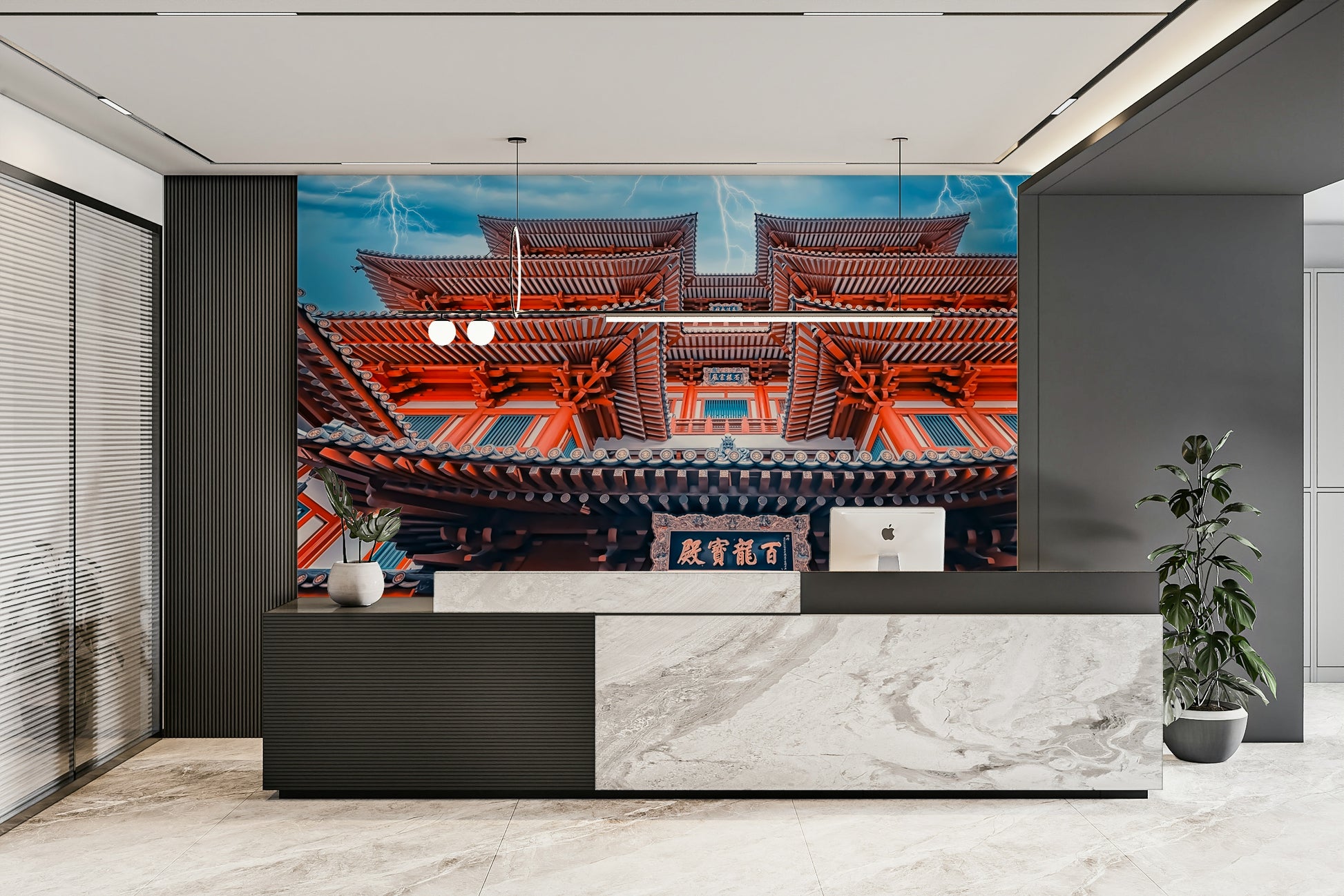 Showcase a bold statement with this stunning architectural wallpaper for walls. The intricate, layered structure of a pagoda against a dramatic sky with lightning creates an intriguing focal point. Rich coral and blue tones add a luxurious, artistic touch. Its bold design complements living rooms, home offices, or entryways, bringing culture and drama indoors.