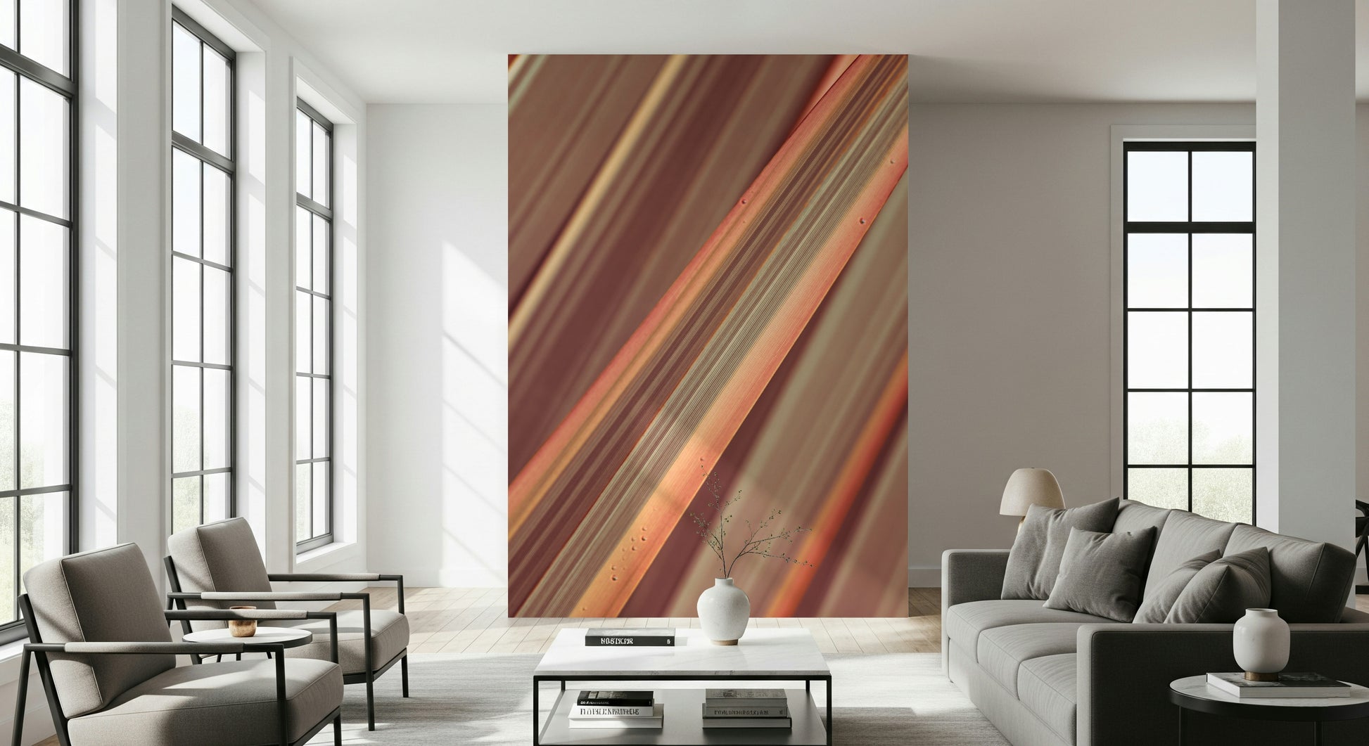 Extreme close-up of leafs, full frame. Update any room with this modern and elegant wallpaper for walls. The design focuses on sleek lines and a sophisticated terra-cotta color scheme. The play of light and shadow creates a dynamic feel. This wallpaper enhances bedrooms, living rooms, and hallways, offering an inviting and stylish ambiance. The blend of earthy tones ensures a seamless match with both neutral and colorful interiors. This pattern makes a statement without overwhelming your space.