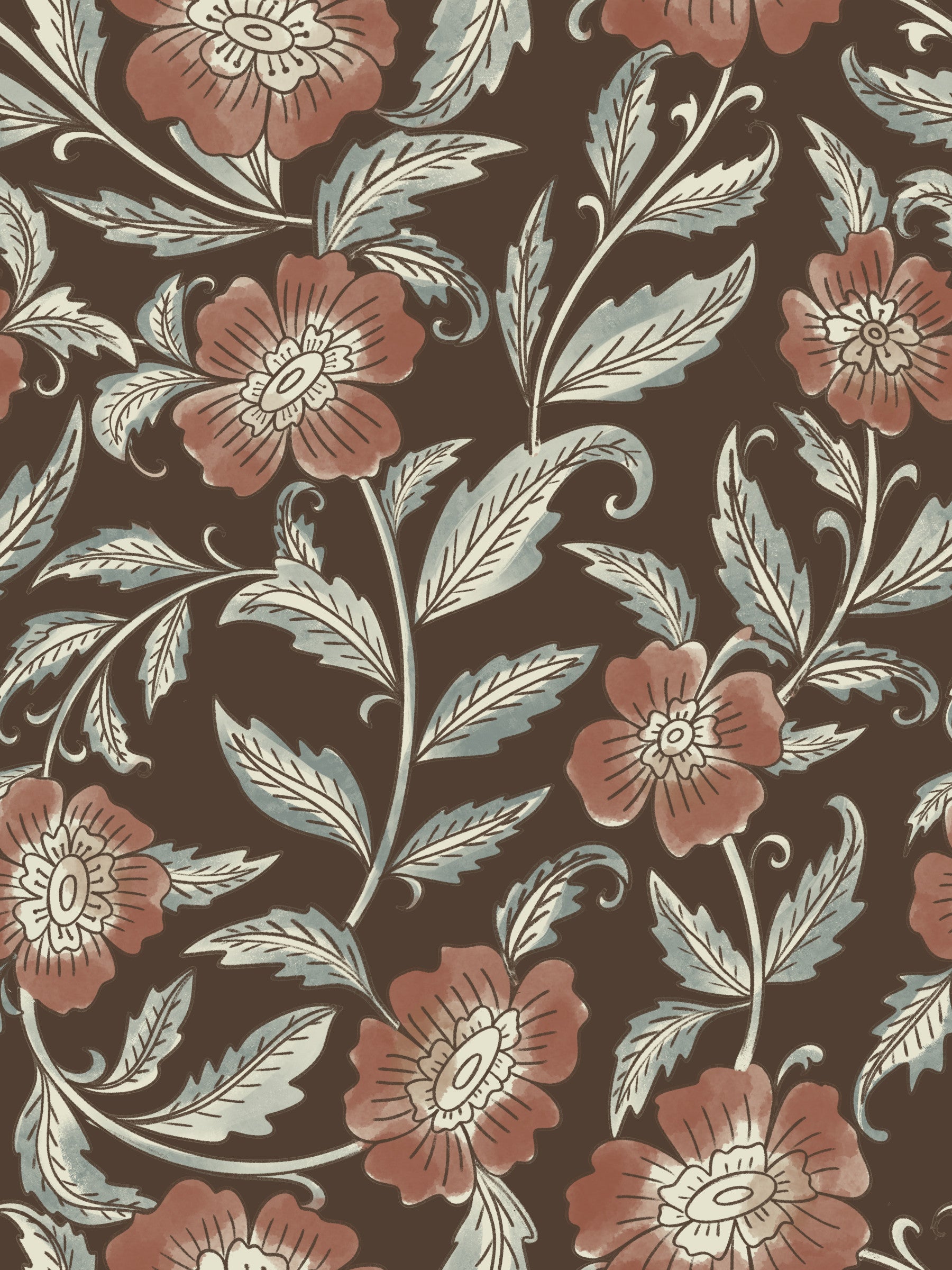 Journey through a landscape of 'Terracotta Trail', a wallpaper design evoking a sense of serene exploration. The rich terracotta tones of the watercolor flowers intertwine with delicate, muted green leaves on a deep brown canvas. Each bloom is rendered with artistic finesse, showcasing a unique blend of hand-drawn elegance and a tranquil, almost meditative quality. This wallpaper design is ideal for those seeking a subtle yet impactful way to introduce nature-inspired style and quiet sophistication into their living spaces.