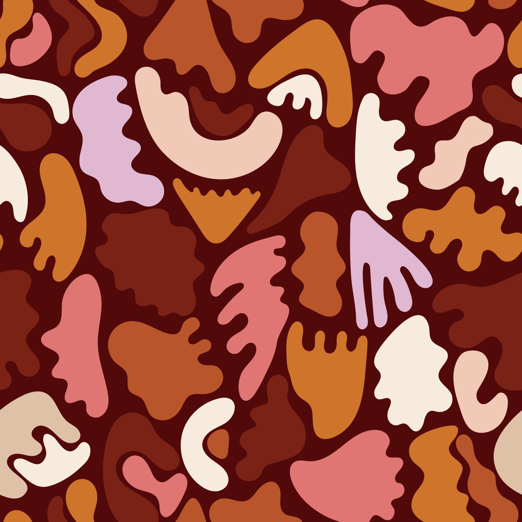 Inspired by the fluid movements of ocean currents and the warmth of terracotta earth, this wallpaper presents a mesmerizing abstract design. The organic shapes, rendered in a palette of rich terracotta, burnt orange, deep red, and soft off-white hues, create a sense of calm and energy. The shapes interweave seamlessly, mimicking the flow of water or the subtle movement of sand dunes. The dark burgundy base accentuates the warm colors, adding a touch of mystery and depth. This wallpaper brings a unique artistic touch to any space, suitable for modern or bohemian interiors.