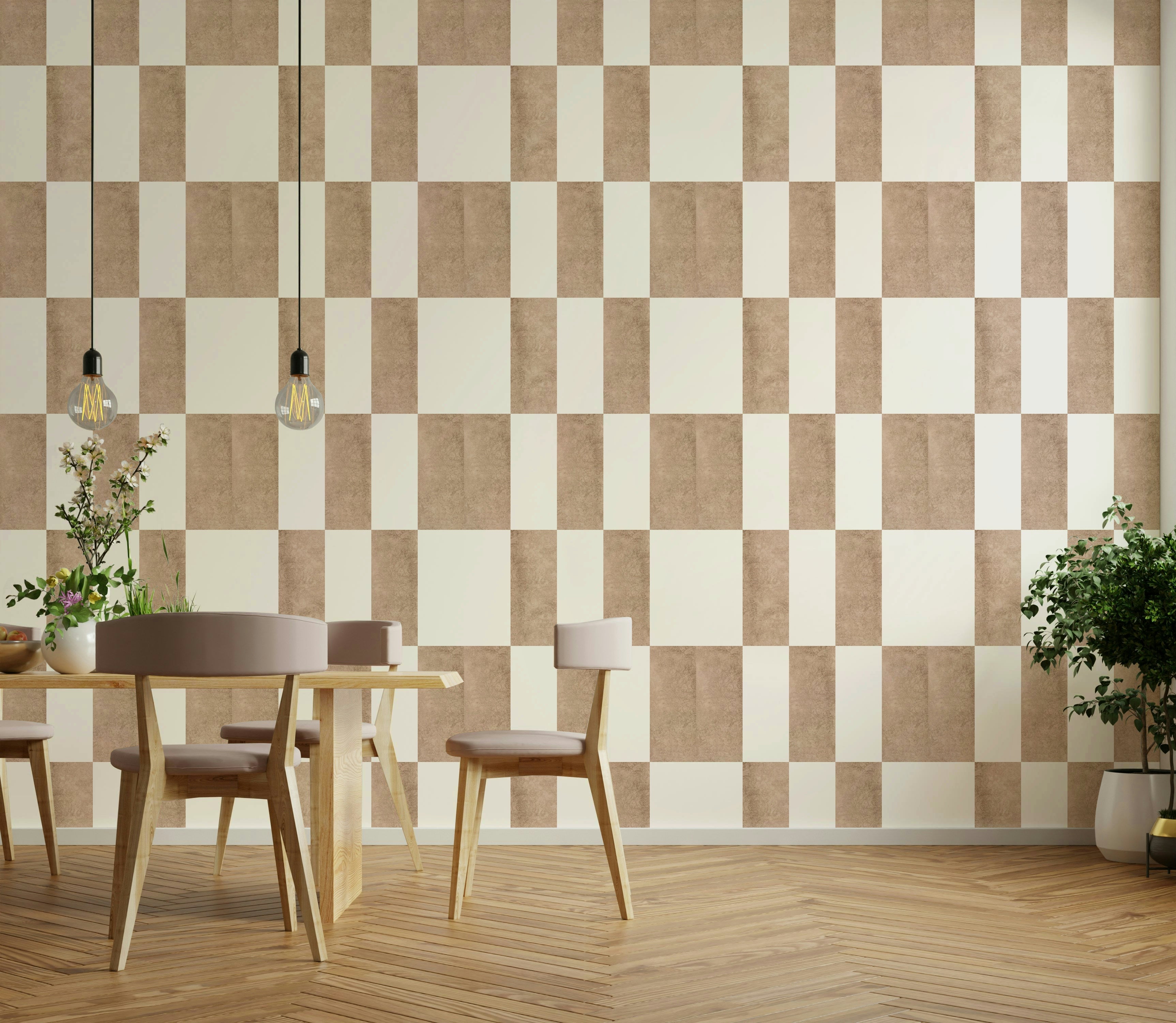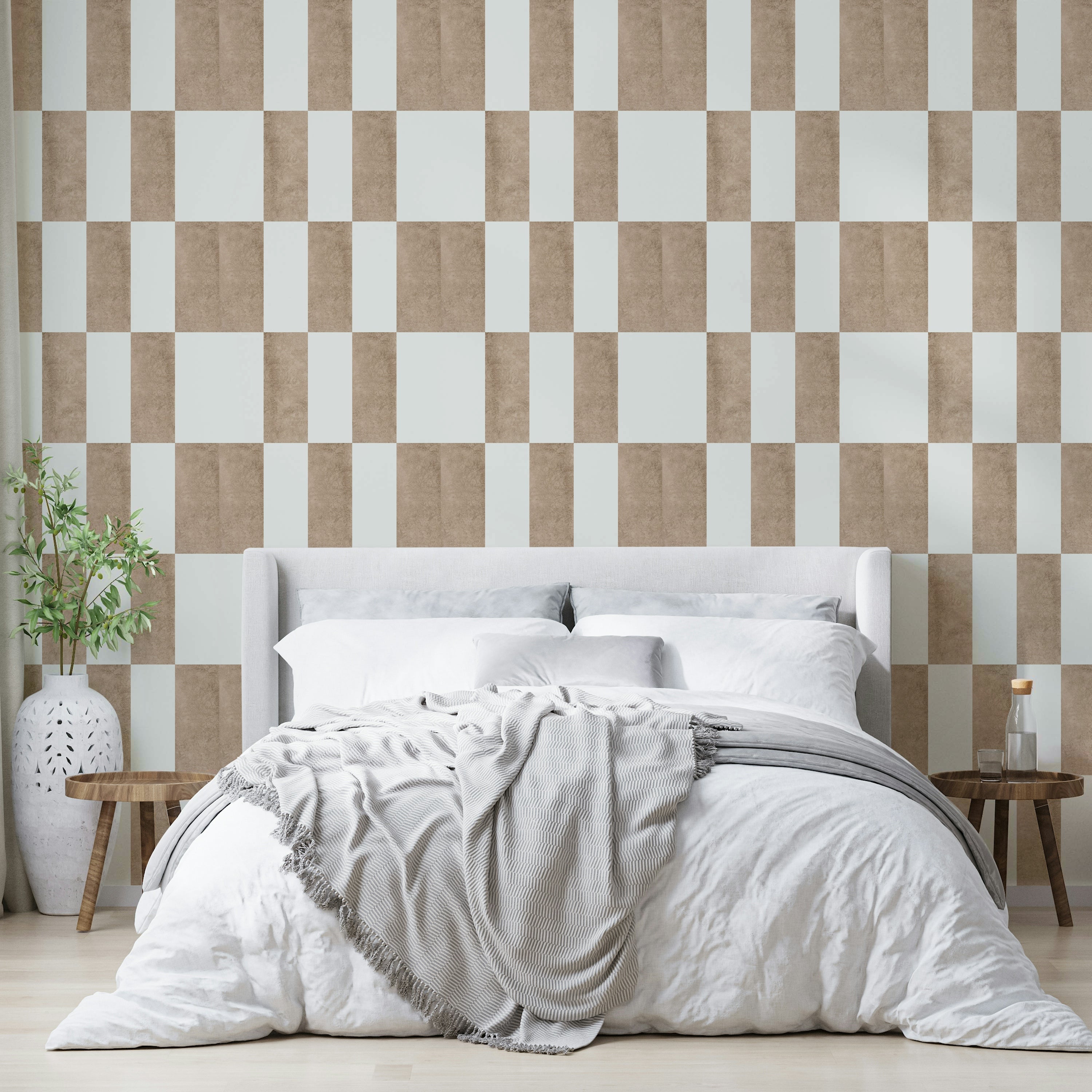 A modern and understated wallpaper design, this pattern plays with contrasting textures and neutral tones. The warm, earthy taupe squares provide a tactile visual, while the crisp white sections offer a clean contrast. This creates a balanced aesthetic that is both stylish and calming. The seamless repeat pattern ensures a cohesive look across any space, ideal for larger areas or smaller accents. This is a versatile choice for various rooms, including living rooms, bedrooms, and even hallways.