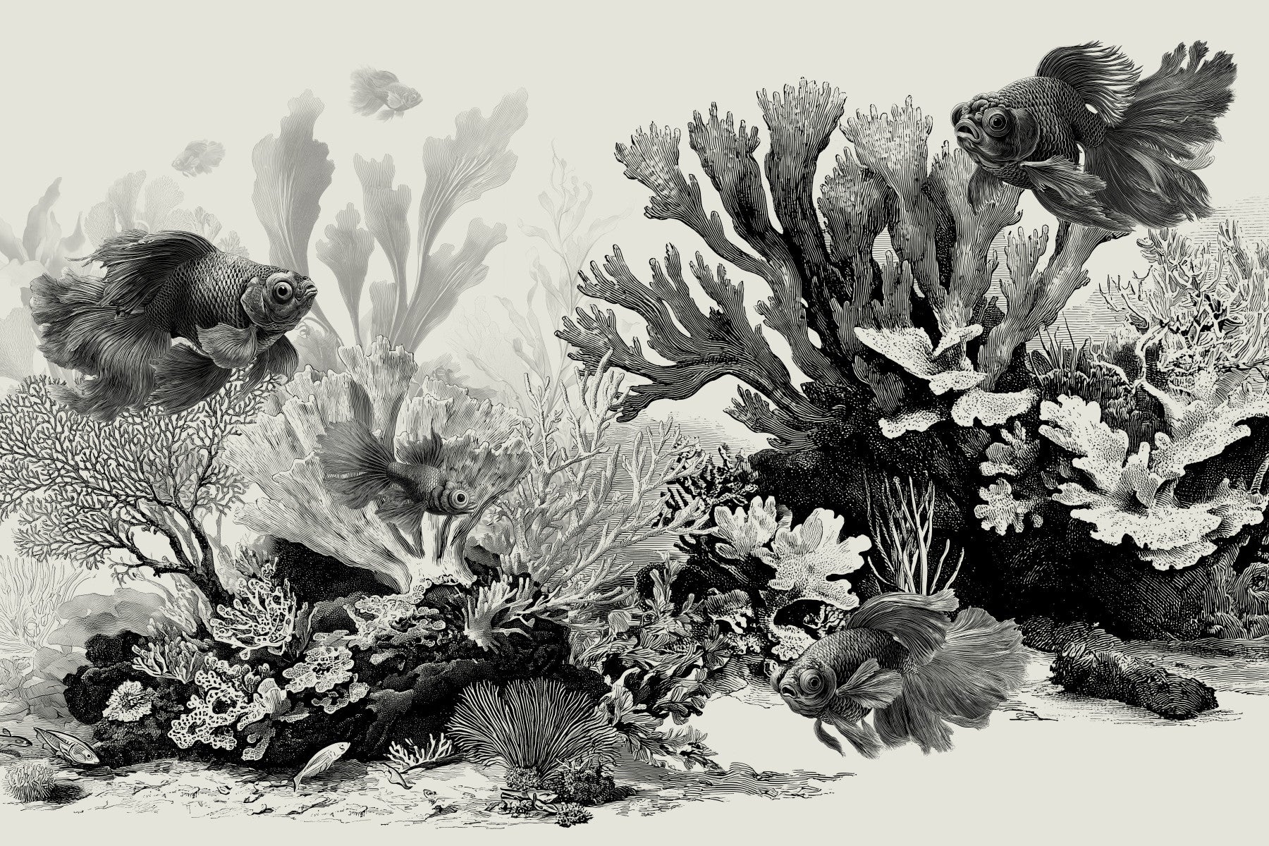 Make a bold statement with the Black and Cream version of The Aquarium mural. This high-contrast design features sharp, black ink illustrations of goldfish and coral set against a warm cream background. The detailed linework mimics classic 19th-century scientific engravings, providing a scholarly yet artistic vibe to your room. This mural is perfect for creating a dramatic accent wall in a study, library, or modern living room. The timeless monochrome palette ensures it never goes out of style while providing a striking focal point. Buy this exquisite black ink marine mural to give your walls a sophisticated edge.