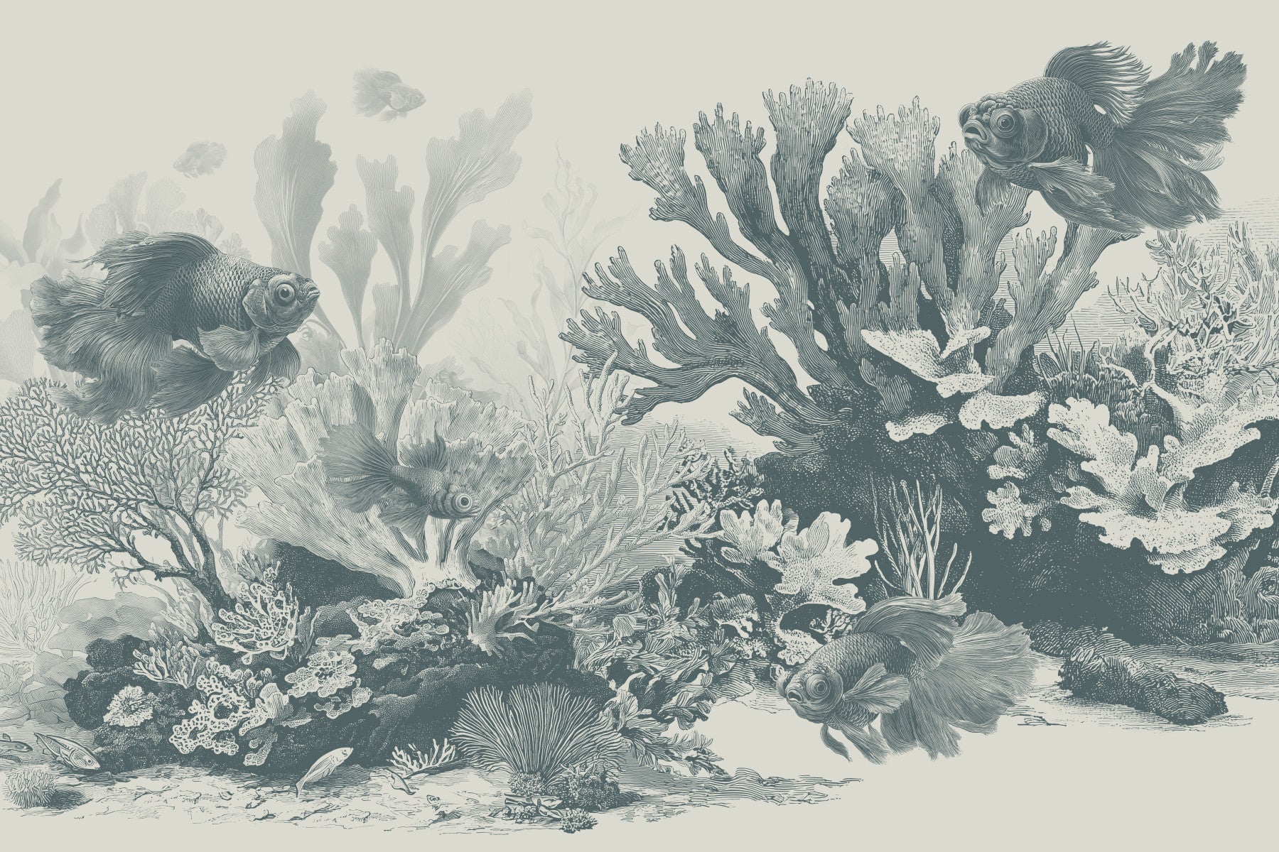 The Aquarium - Teal wallpaper brings a calm, underwater feel to your interior design. Detailed fish glide through a reef of coral, sea fans, and soft plant shapes, all illustrated in a soft teal green range on a rich ivory background. The pattern has a vintage engraving look that feels both classic and modern. Use this wall mural in a bathroom, bedroom, reading nook, or home office for a soothing backdrop, or in a hallway to add gentle visual interest.
