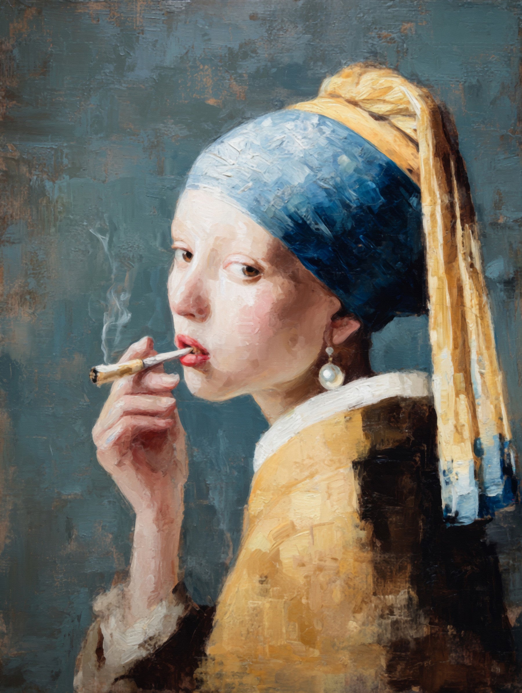 A bold and modern reimagining of a timeless classic, this artwork features the iconic girl with a pearl earring, now shown with a cigarette in hand. Painted in expressive oil textures reminiscent of the Dutch Golden Age, it fuses historical portraiture with contemporary attitude. The moody blue background enhances the striking contrast between old and new. Perfect for eclectic interiors, art lovers, and those who appreciate creative twists on masterpieces and bold conversation pieces.