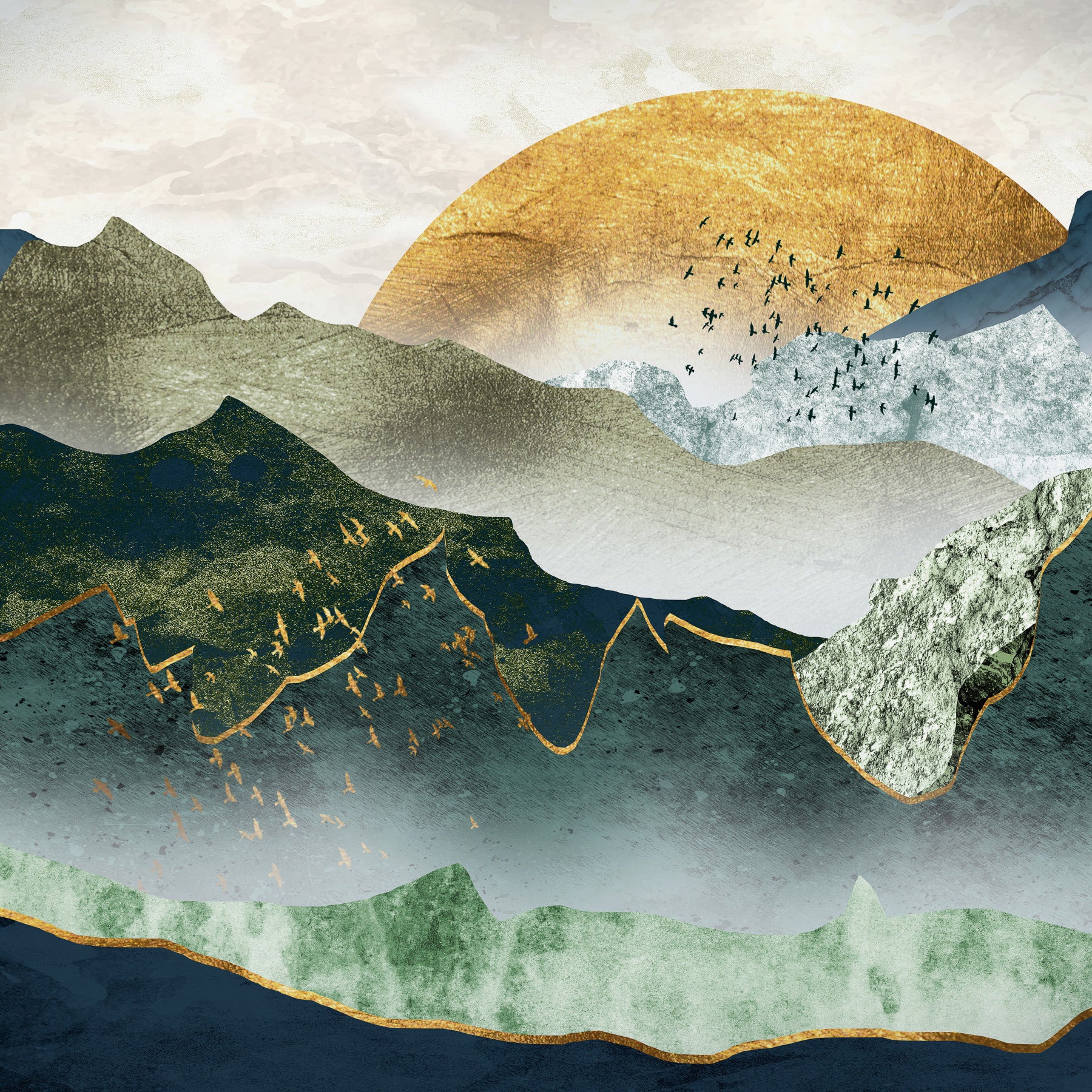 The Green Golden Mountains by Sunset wallpaper blends rich textures and bold colours to create a layered mountain scene. Deep green ridges, soft greys, and gold highlights give the design an artistic feel. A glowing golden sun sets in the background, and birds scattered across the sky add movement. This mural works well in feature walls, living rooms, or creative workspaces. It pairs nicely with gold or brass accents, natural wood tones, and neutral or jewel-coloured furniture. It’s a good fit for anyone who likes a mix of nature and art with a bit of shine and depth.