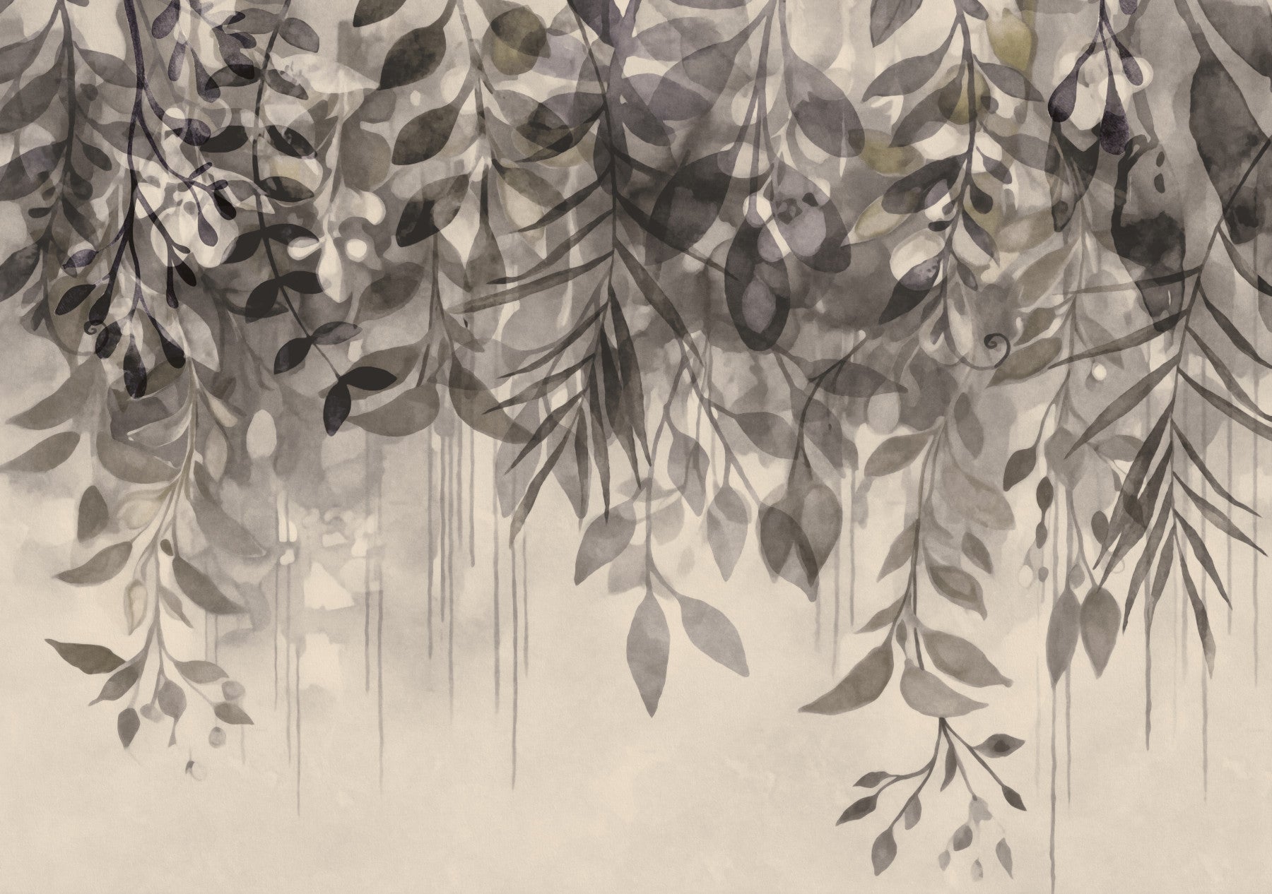 Charming wallpaper featuring loose watercolor brushstrokes that form abstract flowers and foliage in moody tones of grey and beige. Climbing plants cascade gently from above, creating a sense of quiet movement and organic flow. This artwork balances softness and depth, blending artistic freedom with natural beauty—perfect for serene, design-forward interiors seeking a touch of calm sophistication and modern botanical charm.